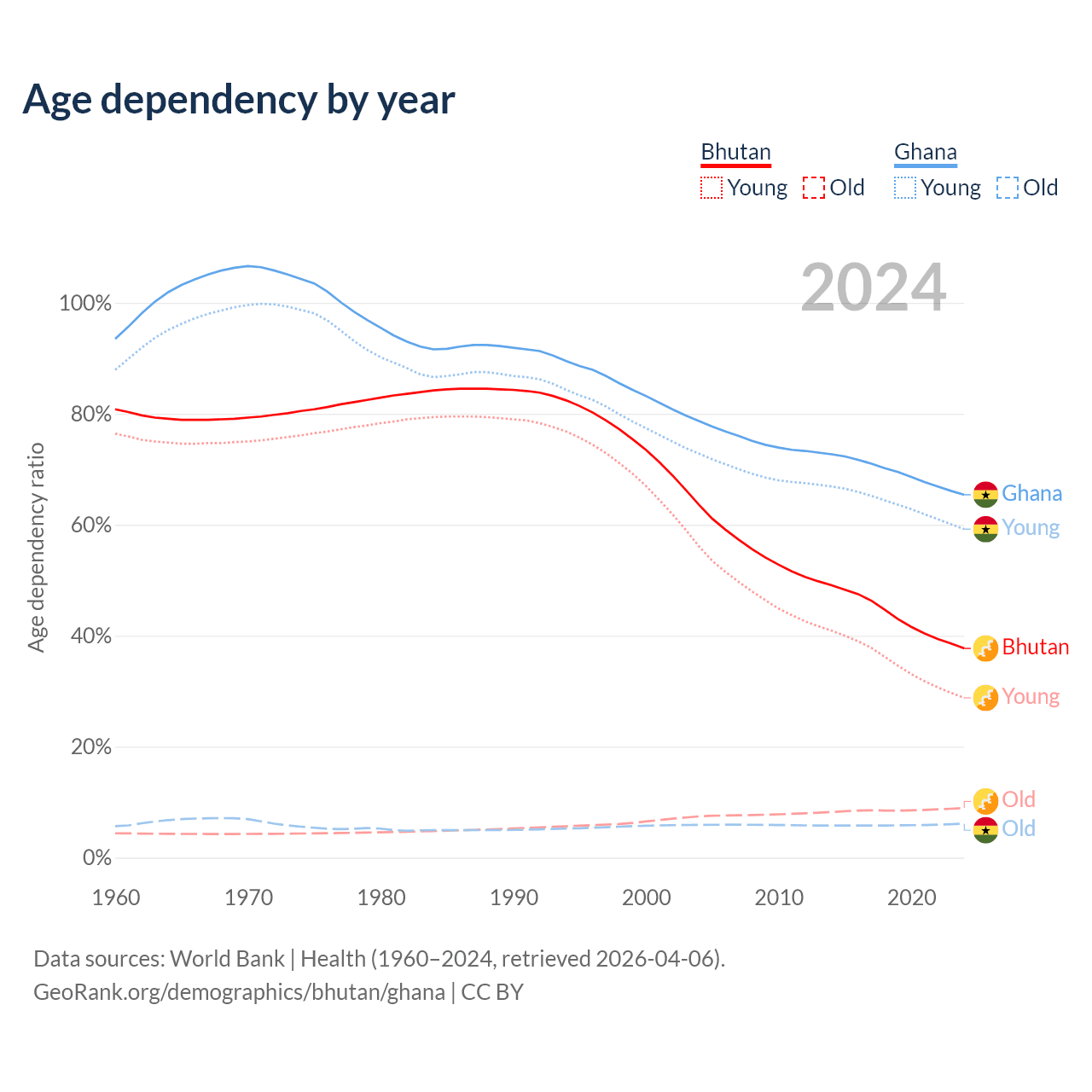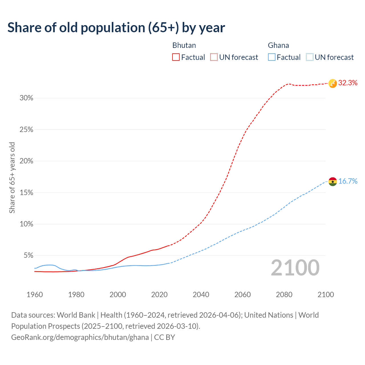 - The share of old-age demographic (65+) in Bhutan is 6.49% vs 3.71% in Ghana.