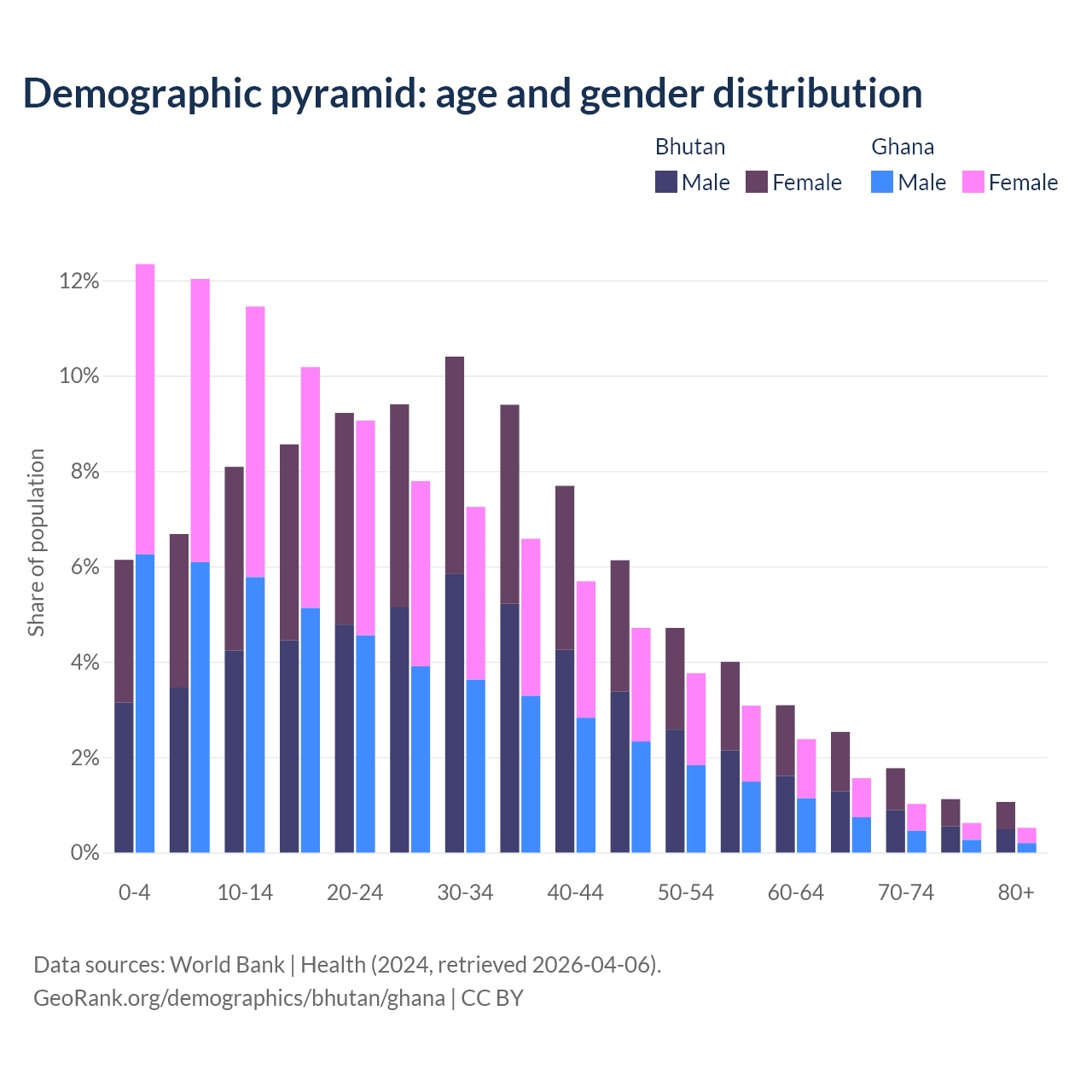 - Bhutan is ranked 95/196 by median age (oldest to youngest) vs 146/196 for Ghana.
