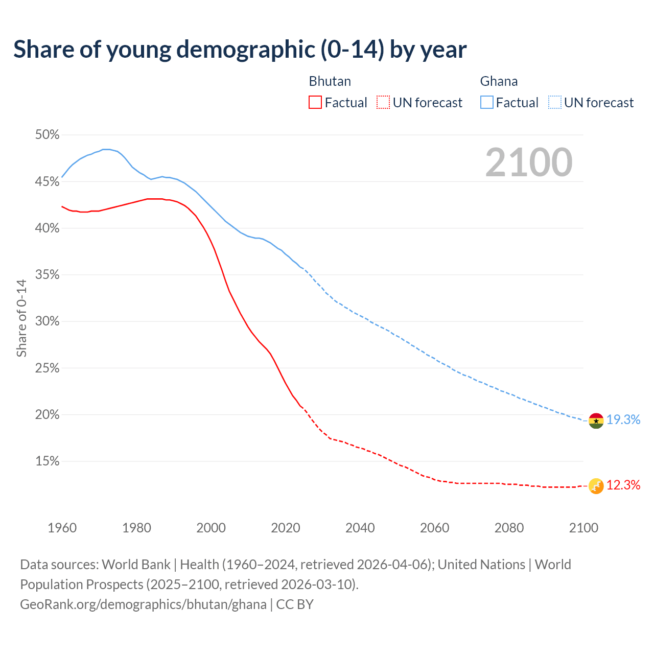 - The share of young demographic (0-15 years old) in Bhutan is 20.9% vs 35.8% in Ghana.