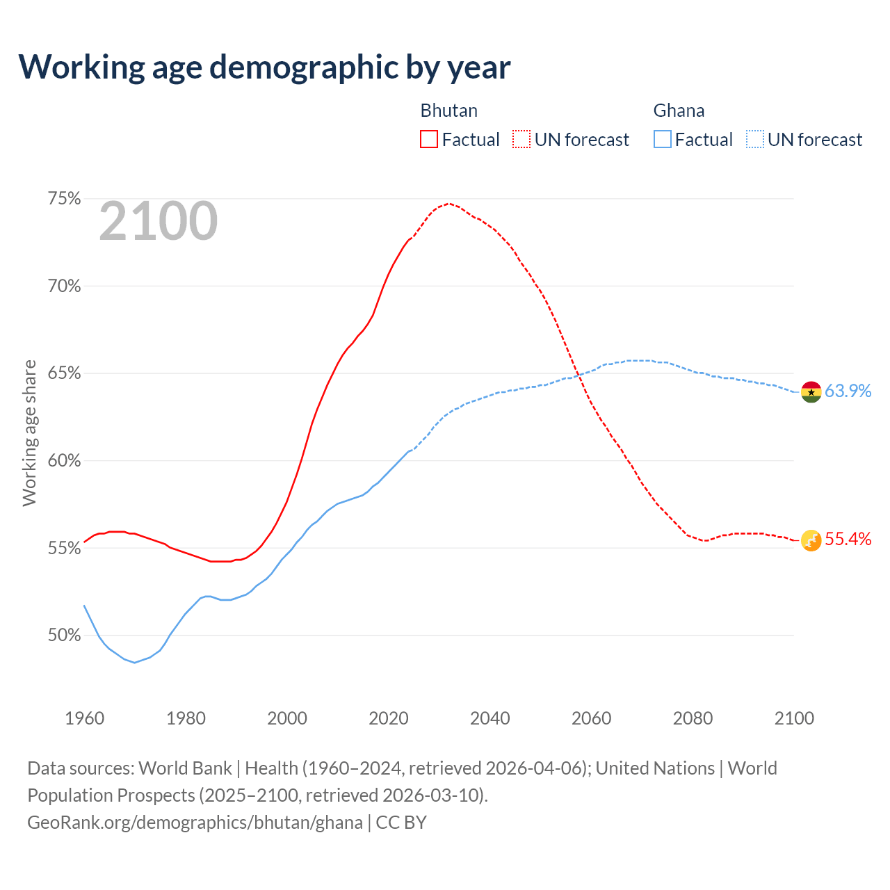 - Bhutan has 583K working age adults (aged 15-64) vs 21.7M in Ghana.