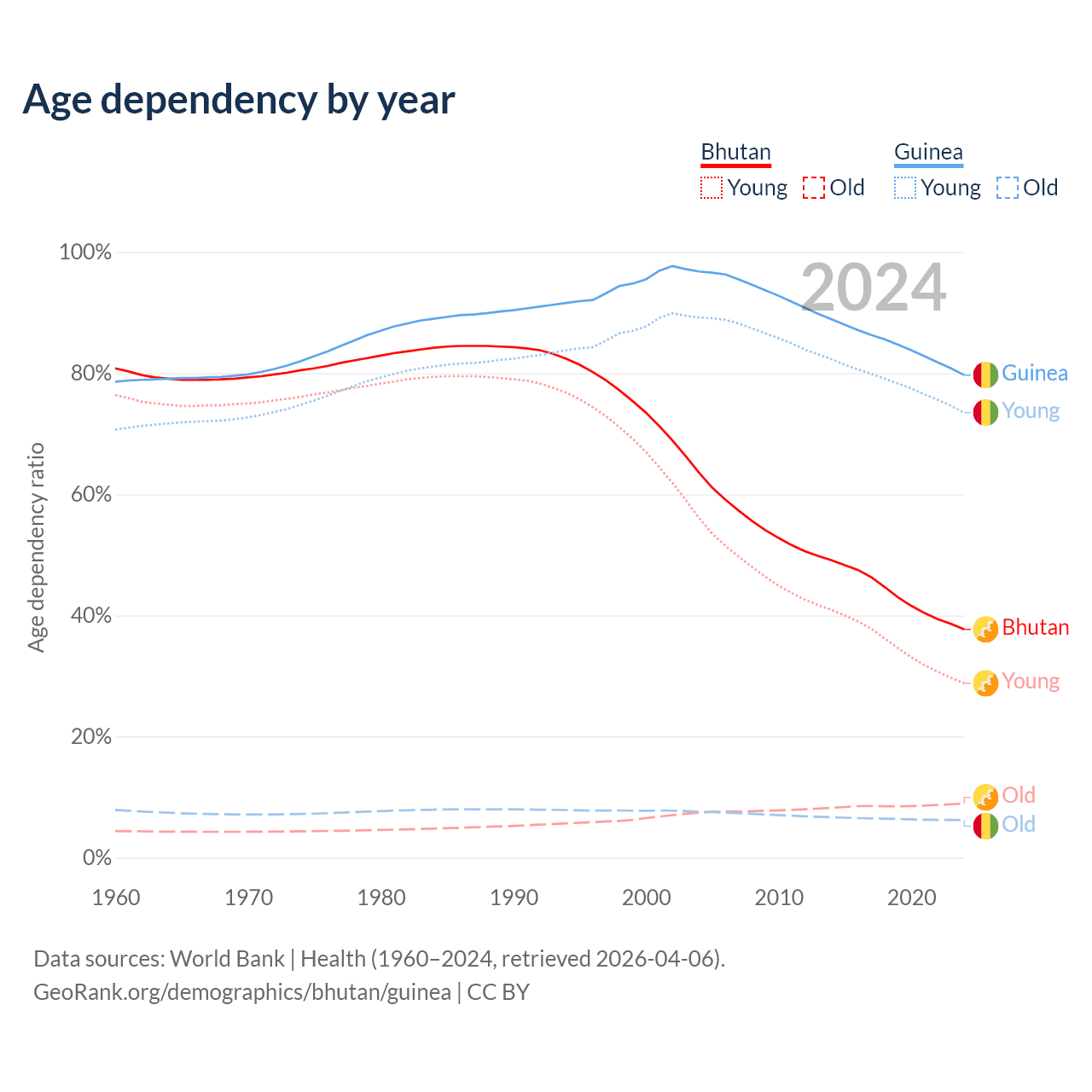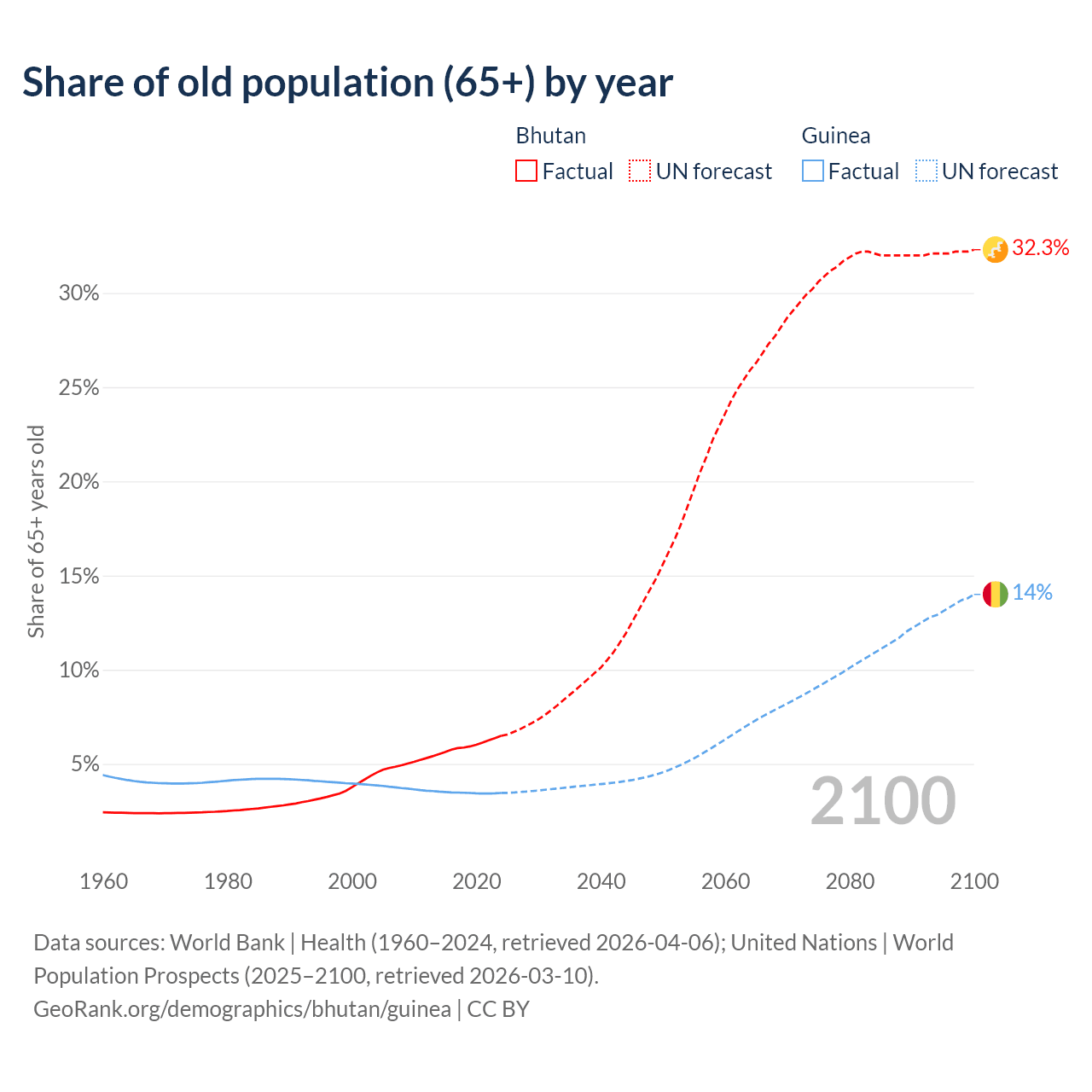 - The share of old-age demographic (65+) in Bhutan is 6.49% vs 3.46% in Guinea.