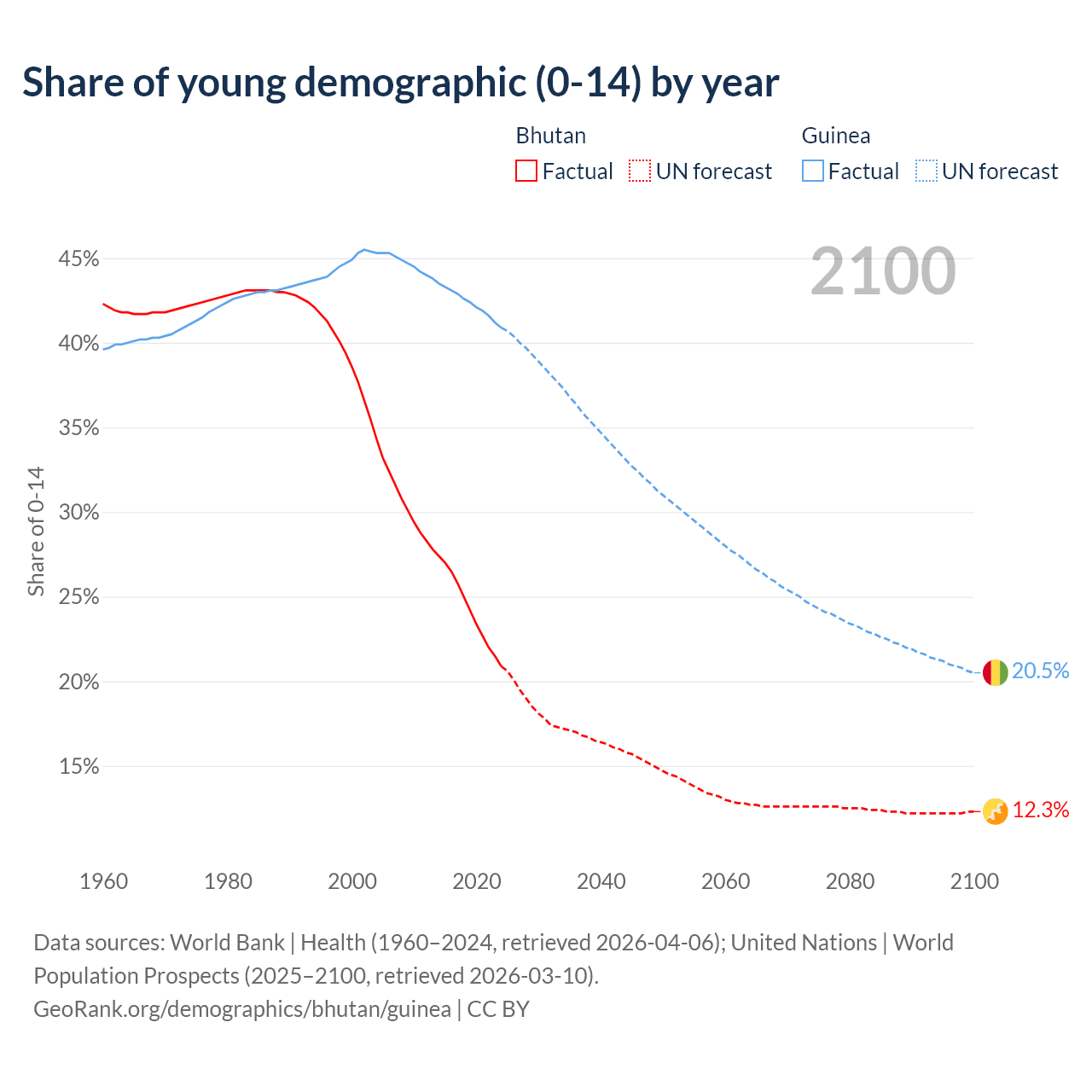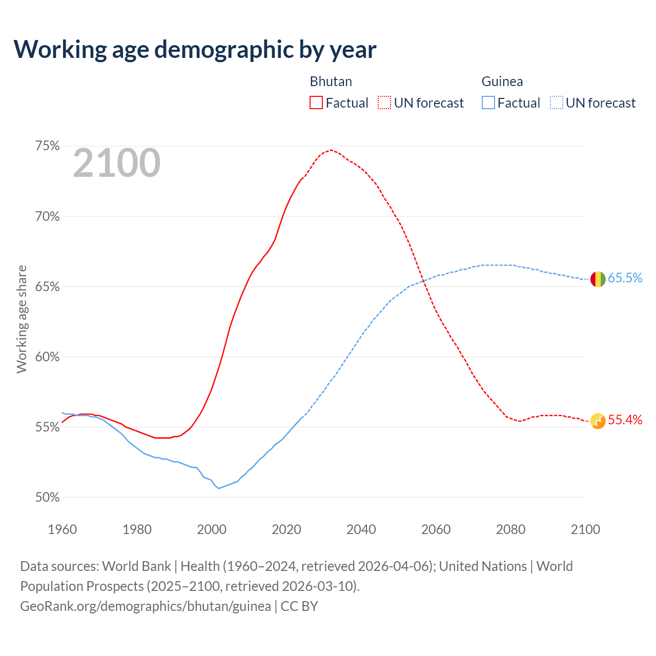 Median age Bhutan vs Guinea, 1960-2100