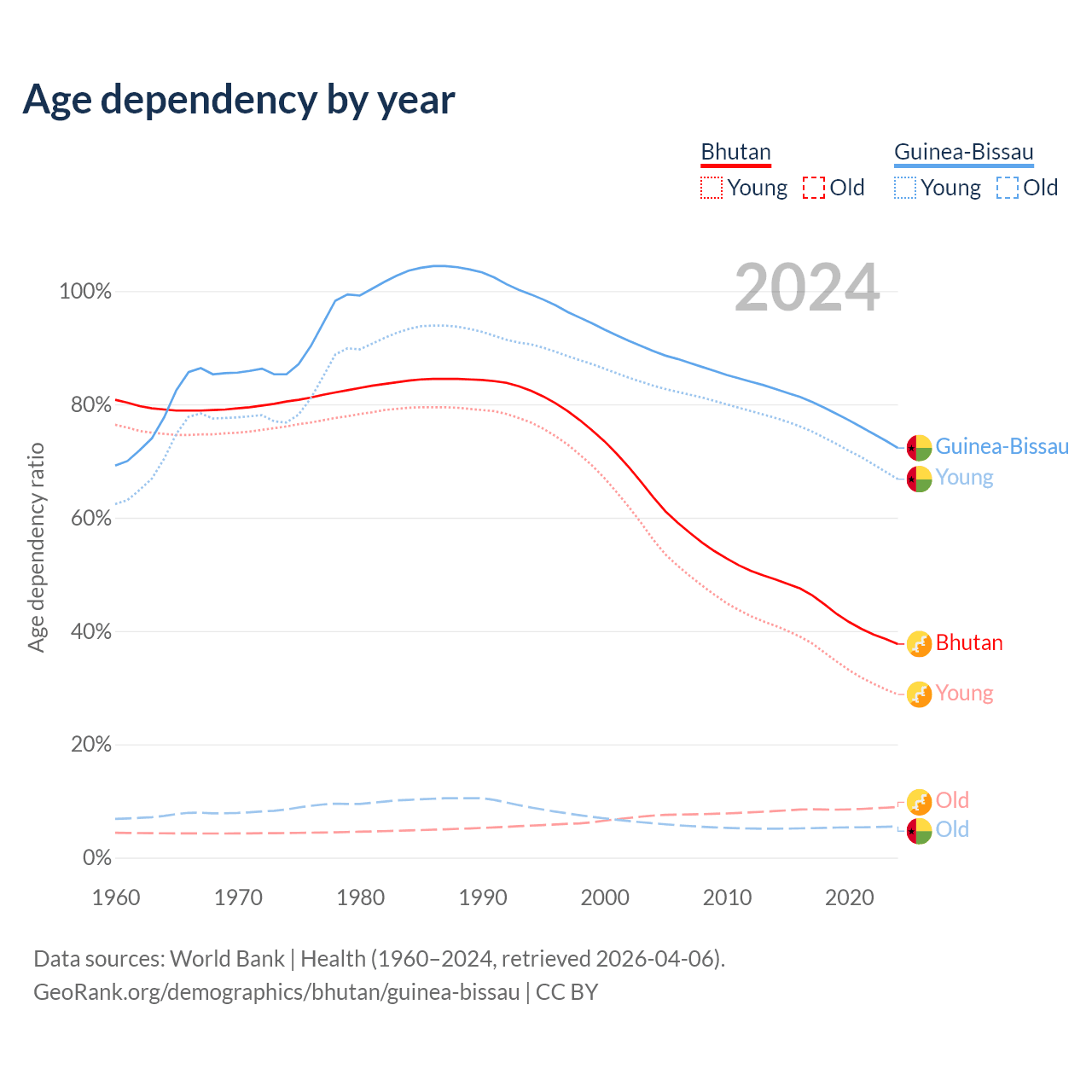 - The share of old-age demographic (65+) in Bhutan is 6.49% vs 3.19% in Guinea-Bissau.