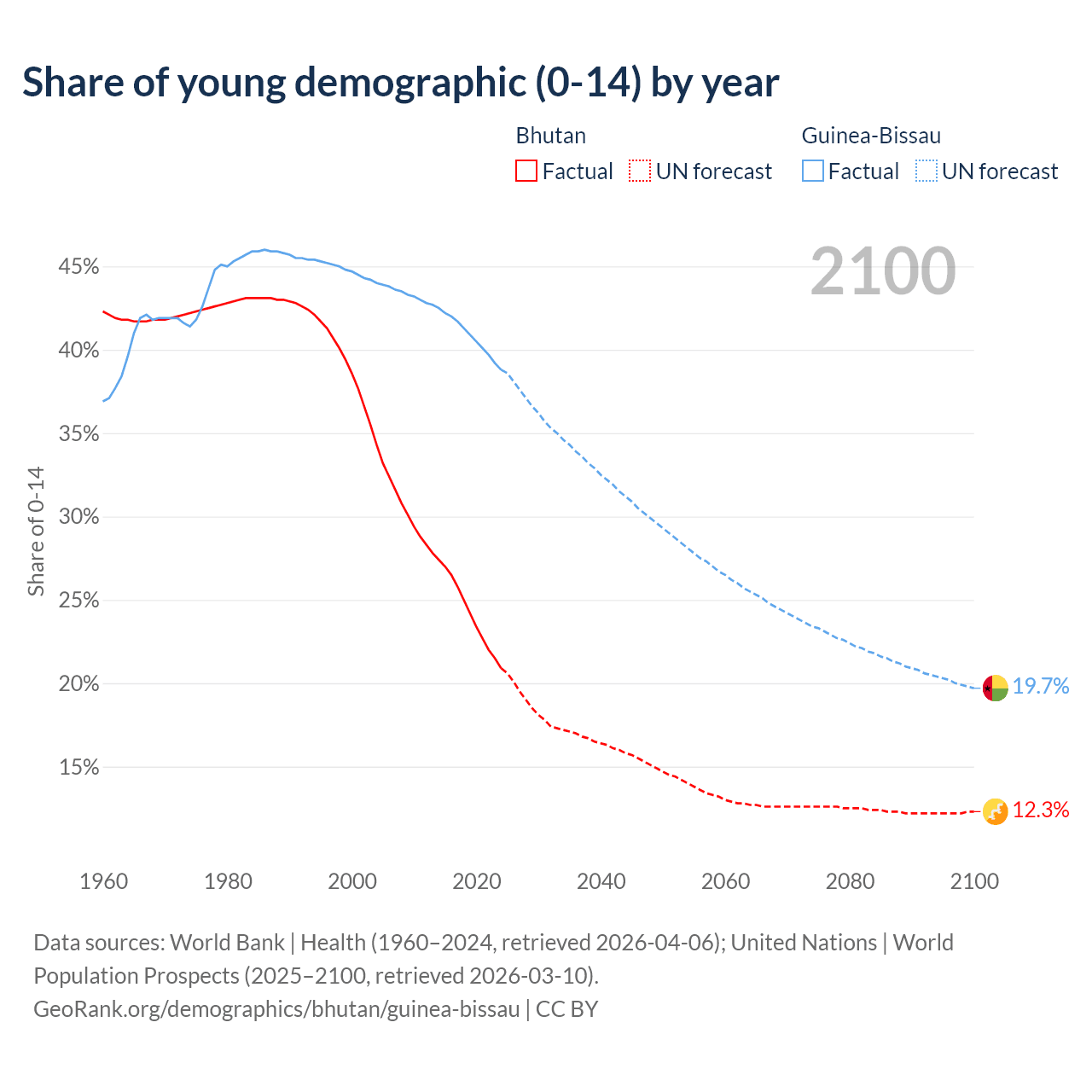 - The share of young demographic (0-15 years old) in Bhutan is 20.9% vs 38.8% in Guinea-Bissau.