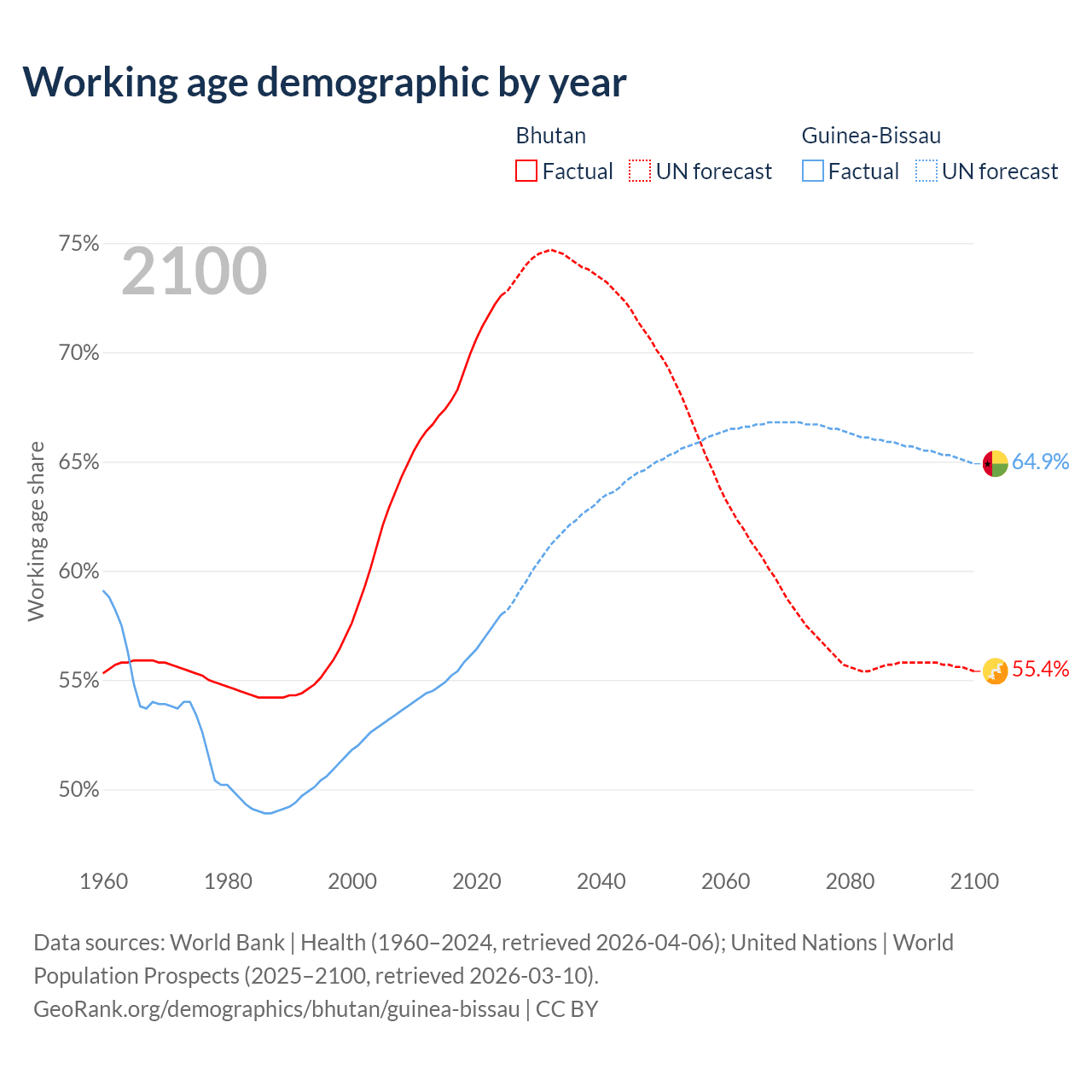 - Bhutan has 583K working age adults (aged 15-64) vs 1.34M in Guinea-Bissau.