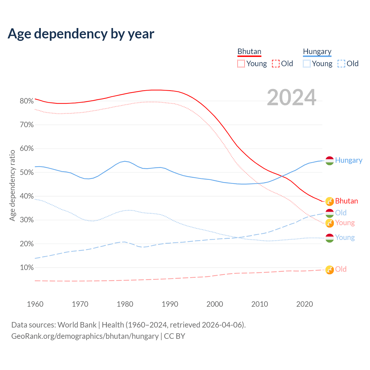 - Bhutan is ranked 95/196 by median age (oldest to youngest) vs 17/196 for Hungary.