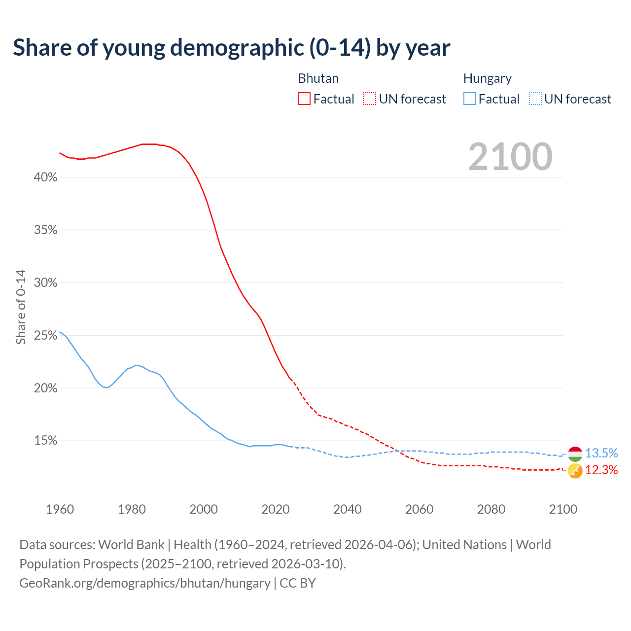 - The share of young demographic (0-15 years old) in Bhutan is 20.9% vs 14.4% in Hungary.