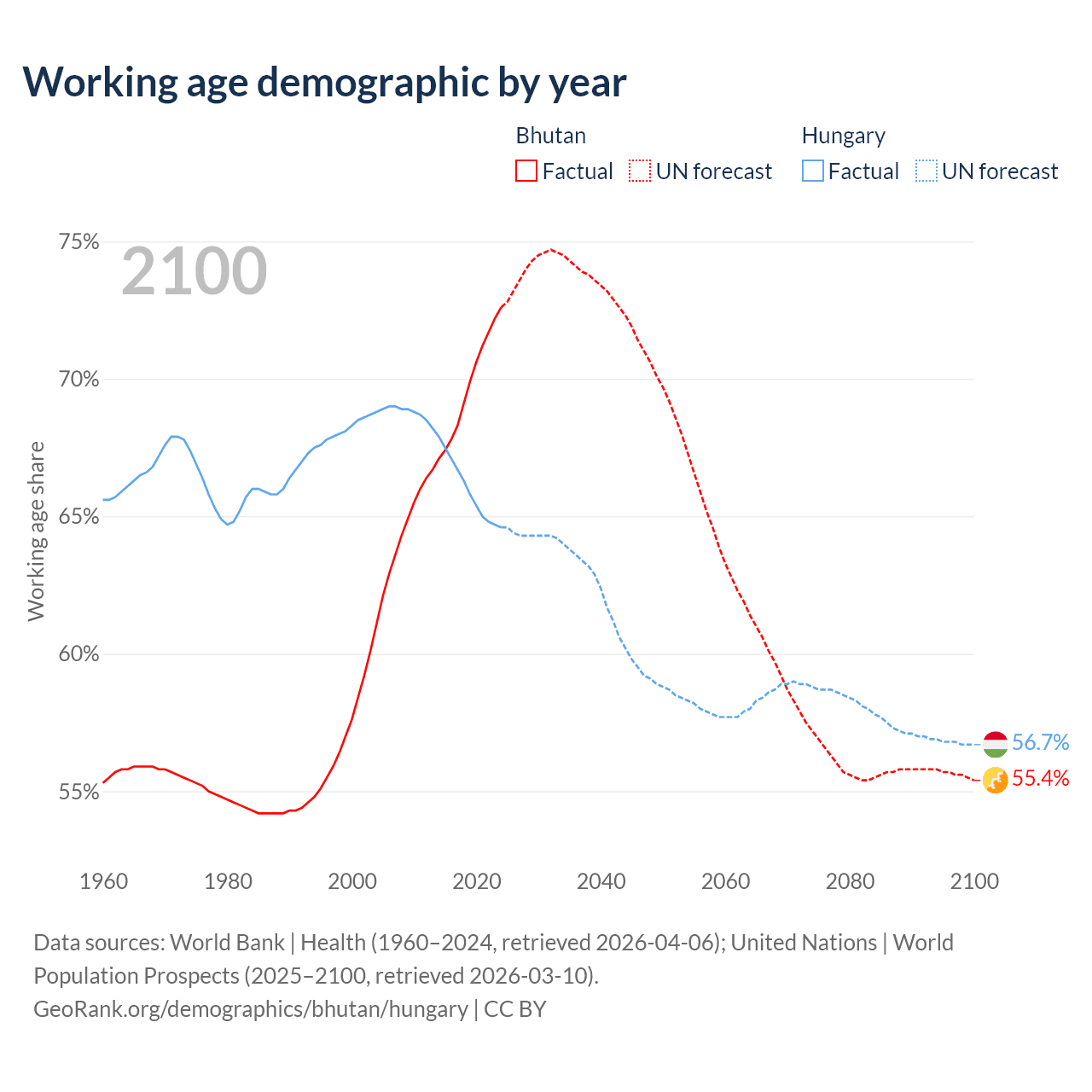 Median age Bhutan vs Hungary, 1960-2100