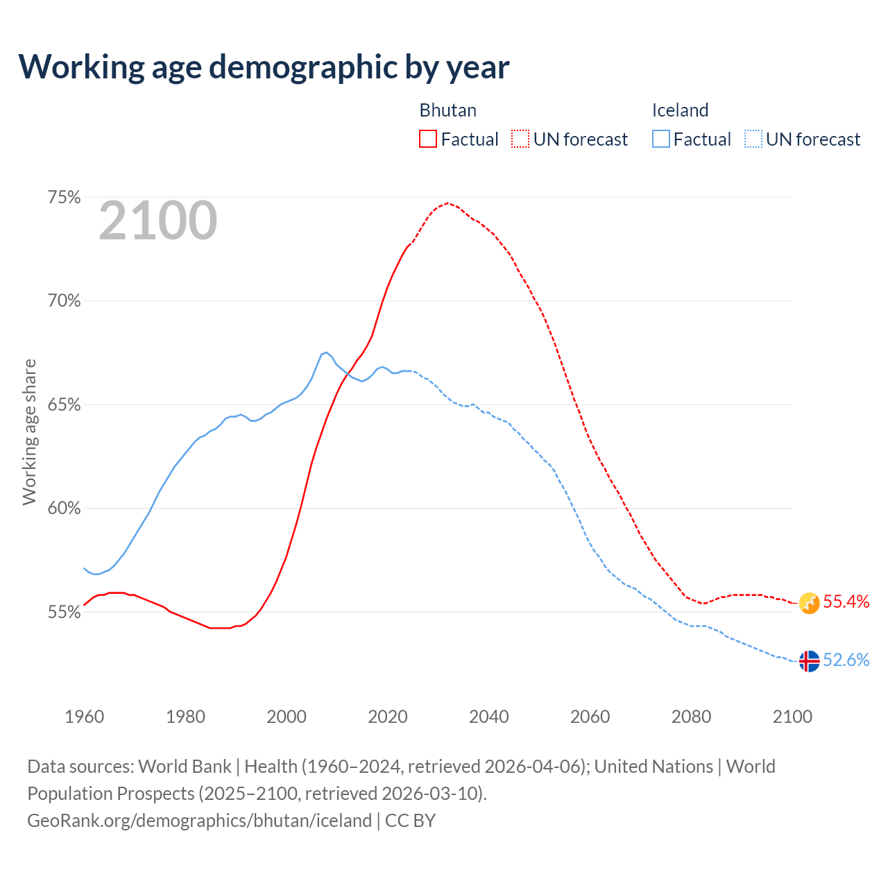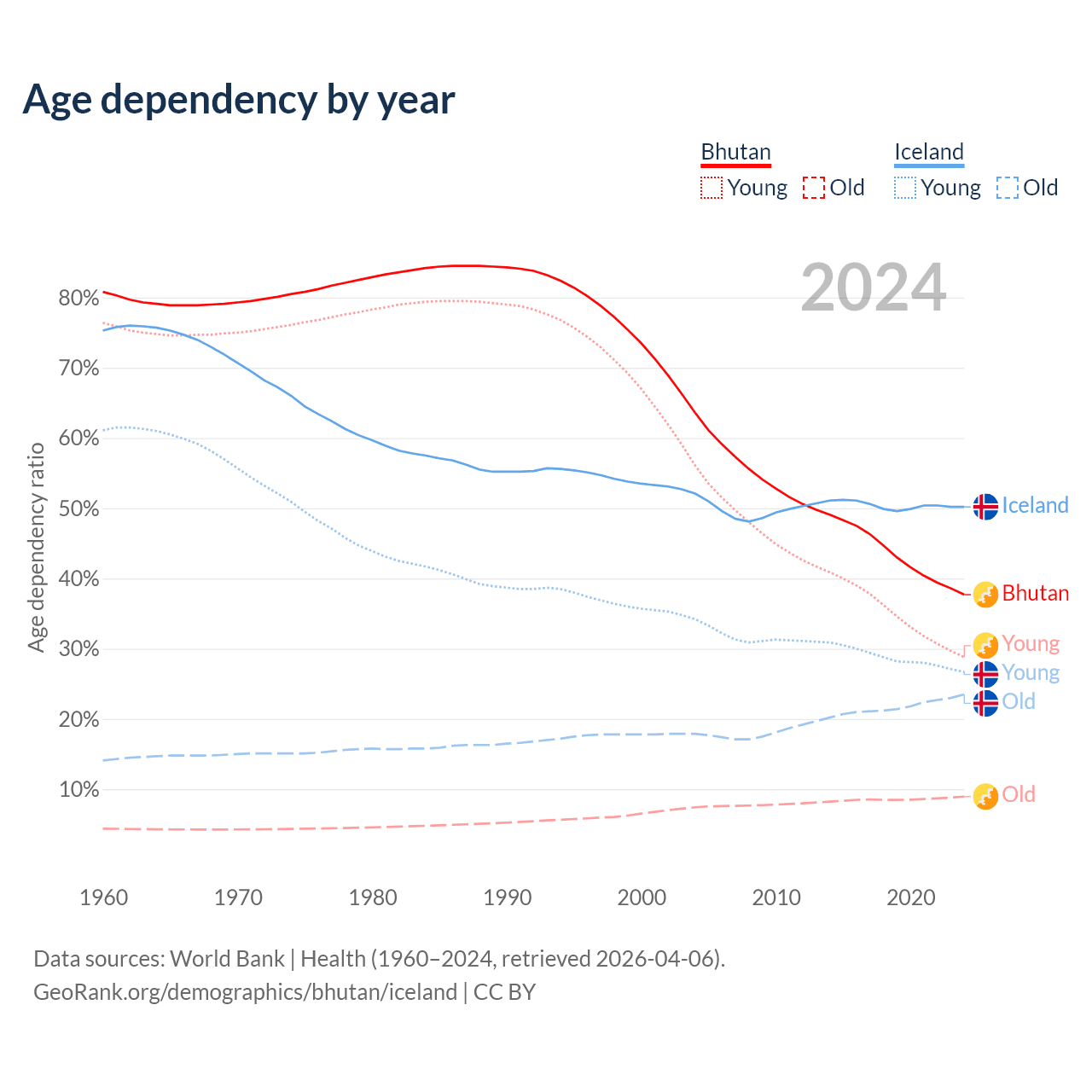 - The share of young demographic (0-15 years old) in Bhutan is 20.9% vs 17.8% in Iceland.