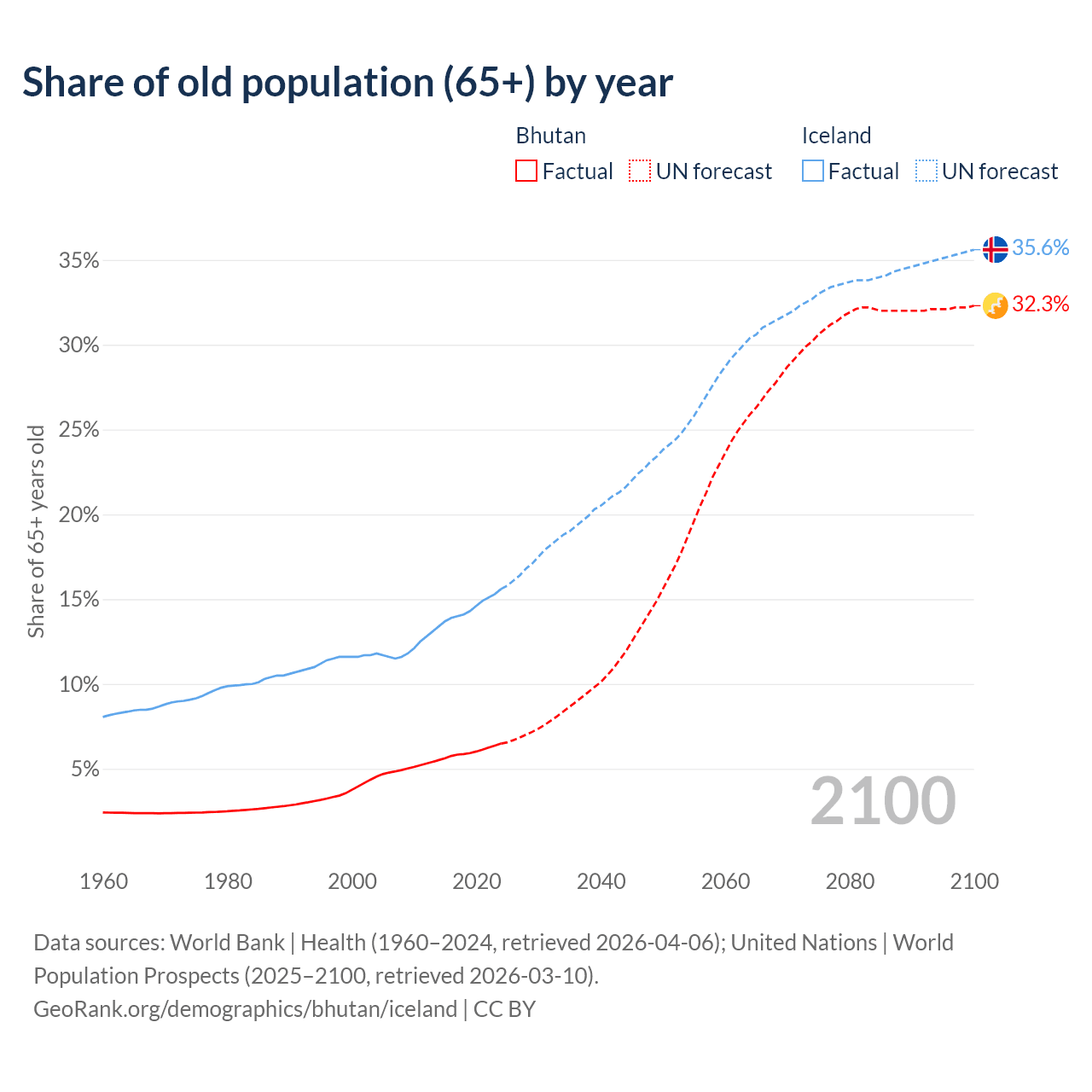 The share of older people aged 65 and over is 6.49% in Bhutan and 15.6% in Iceland. Life expectancy in Bhutan compared to Iceland .