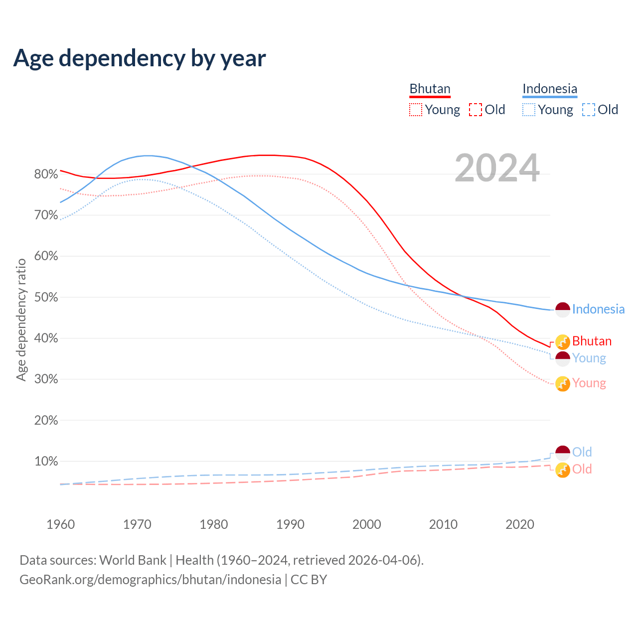 - Bhutan is ranked 95/196 by median age (oldest to youngest) vs 93/196 for Indonesia.