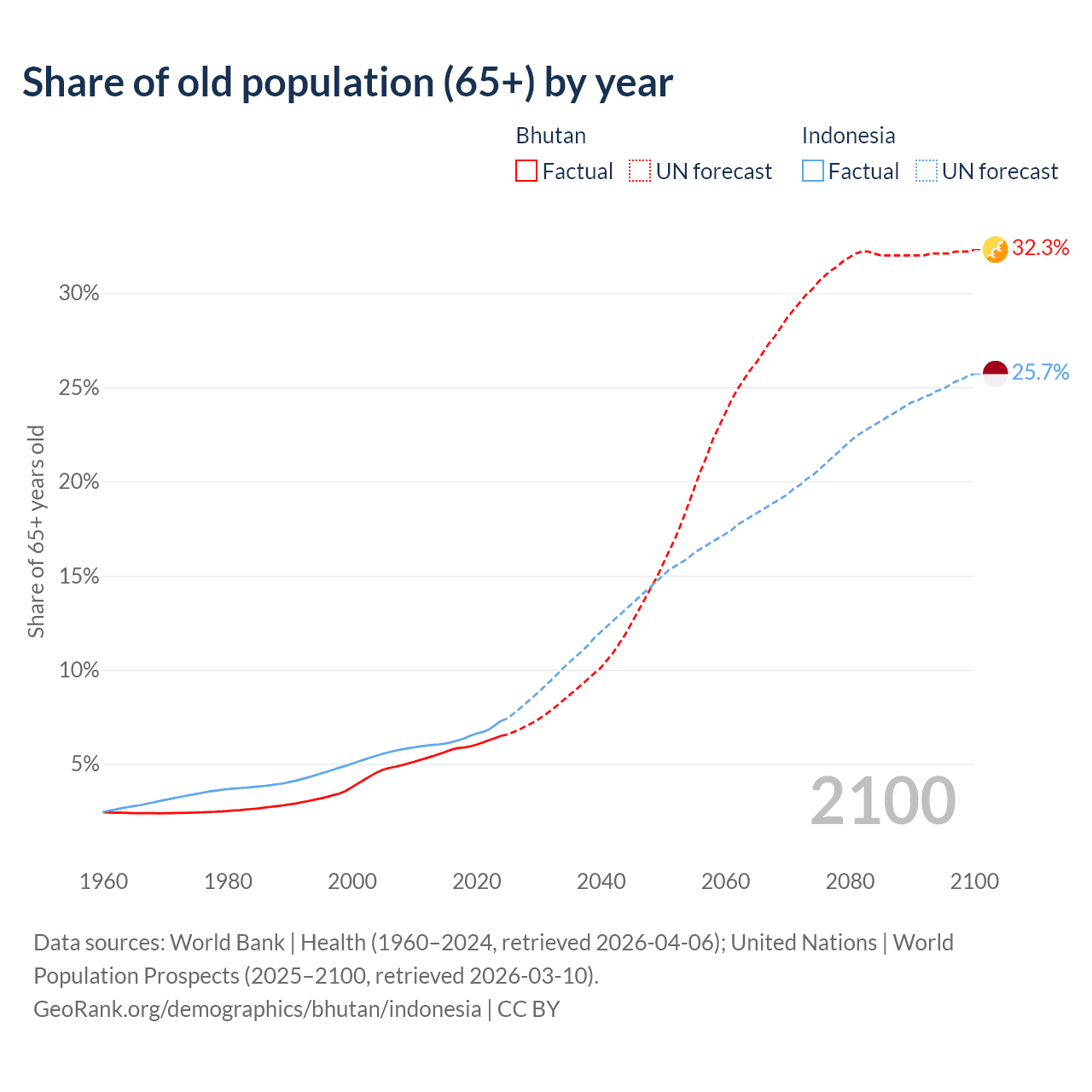 - The share of old-age demographic (65+) in Bhutan is 6.49% vs 7.29% in Indonesia.