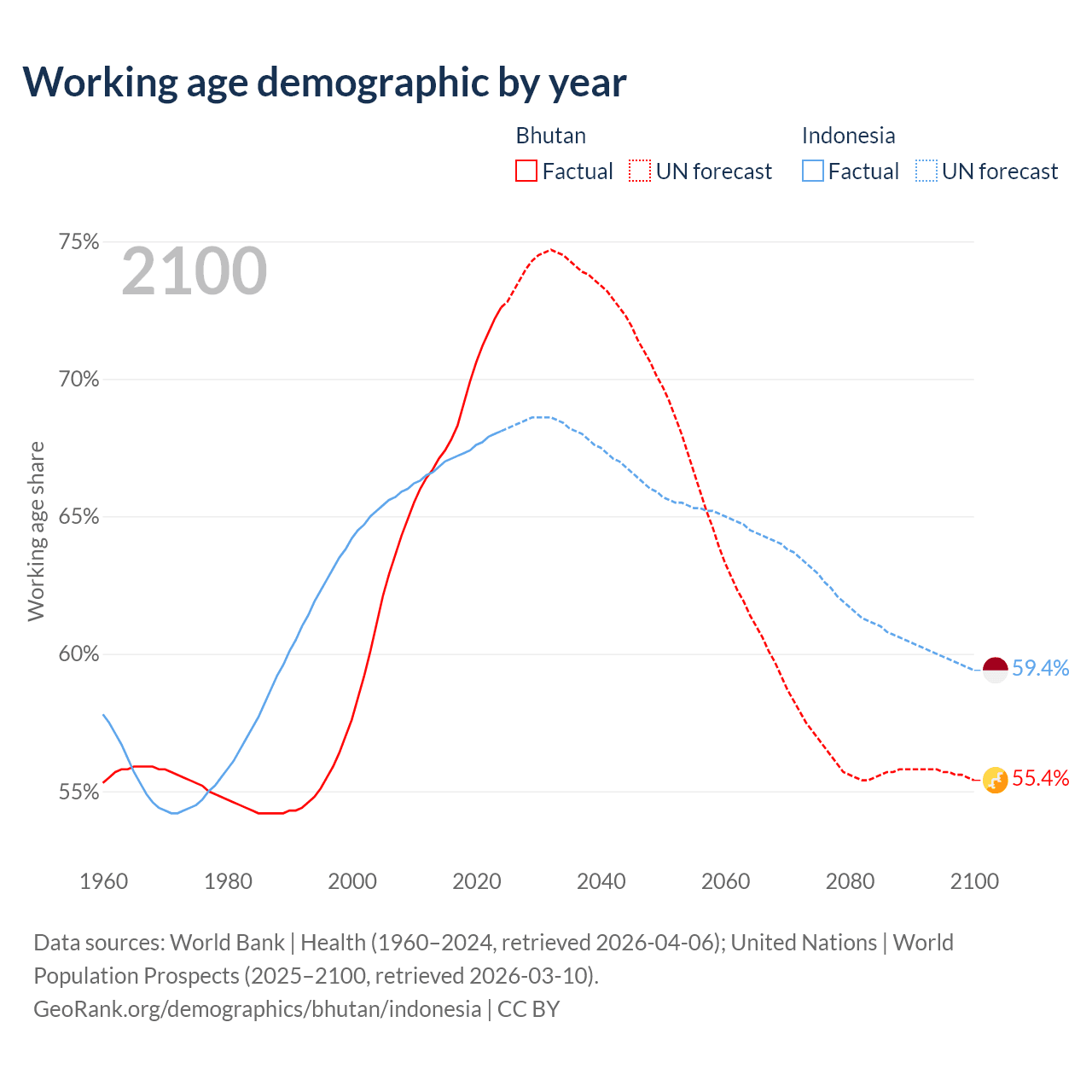 - Bhutan has 583K working age adults (aged 15-64) vs 197M in Indonesia.