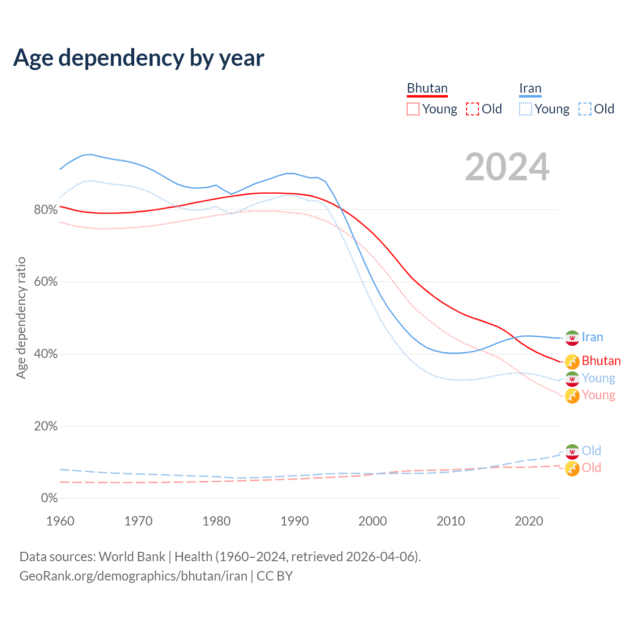 - The share of old-age demographic (65+) in Bhutan is 6.49% vs 8.24% in Iran.