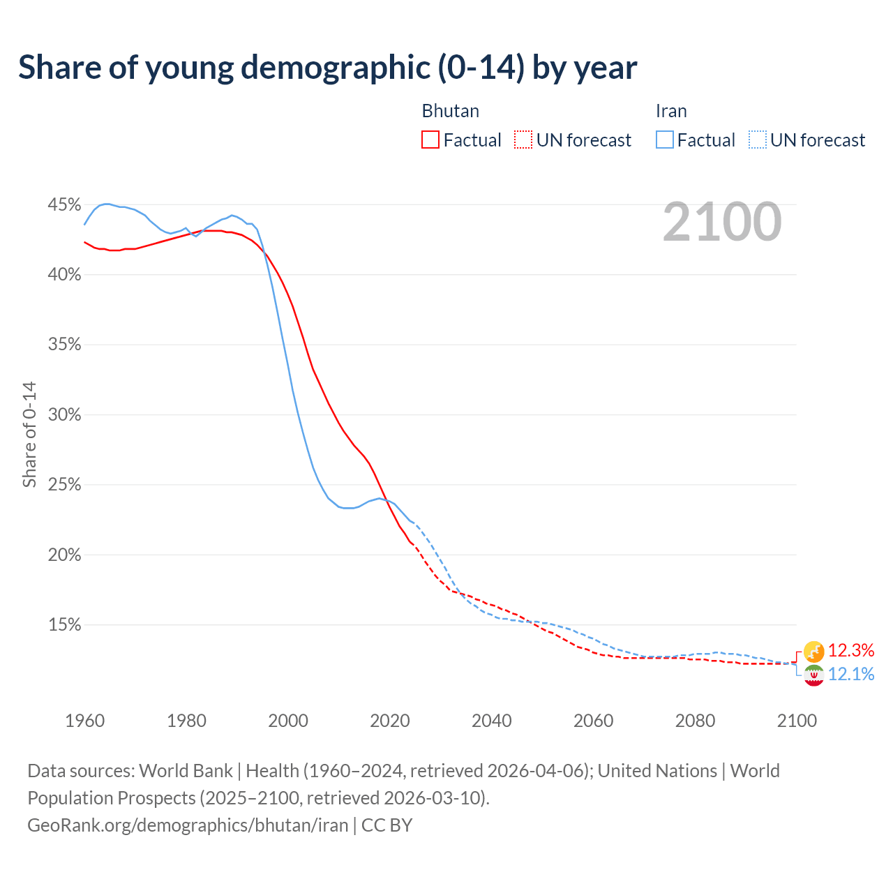 - The share of young demographic (0-15 years old) in Bhutan is 20.9% vs 22.4% in Iran.