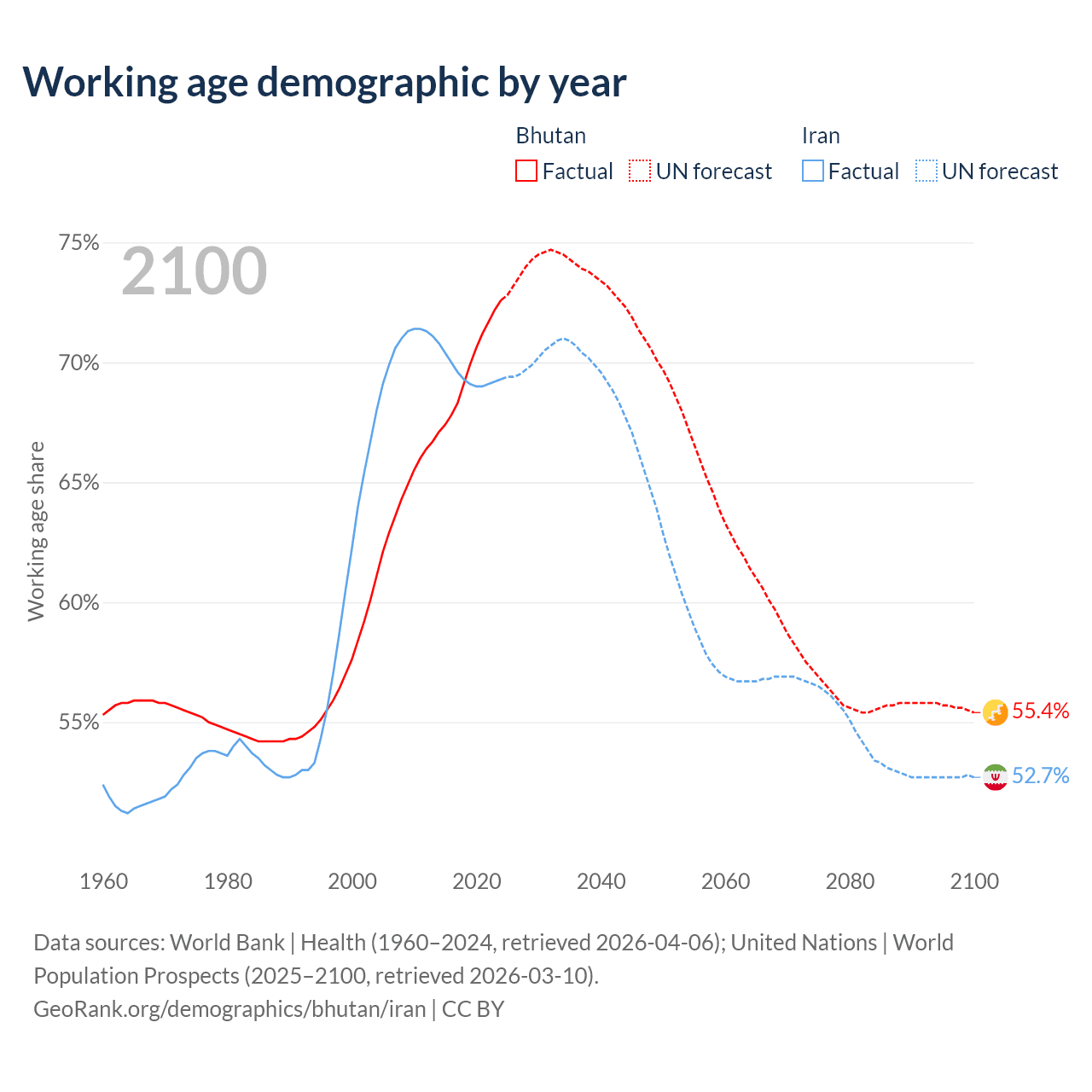 Median age Bhutan vs Iran, 1960-2100