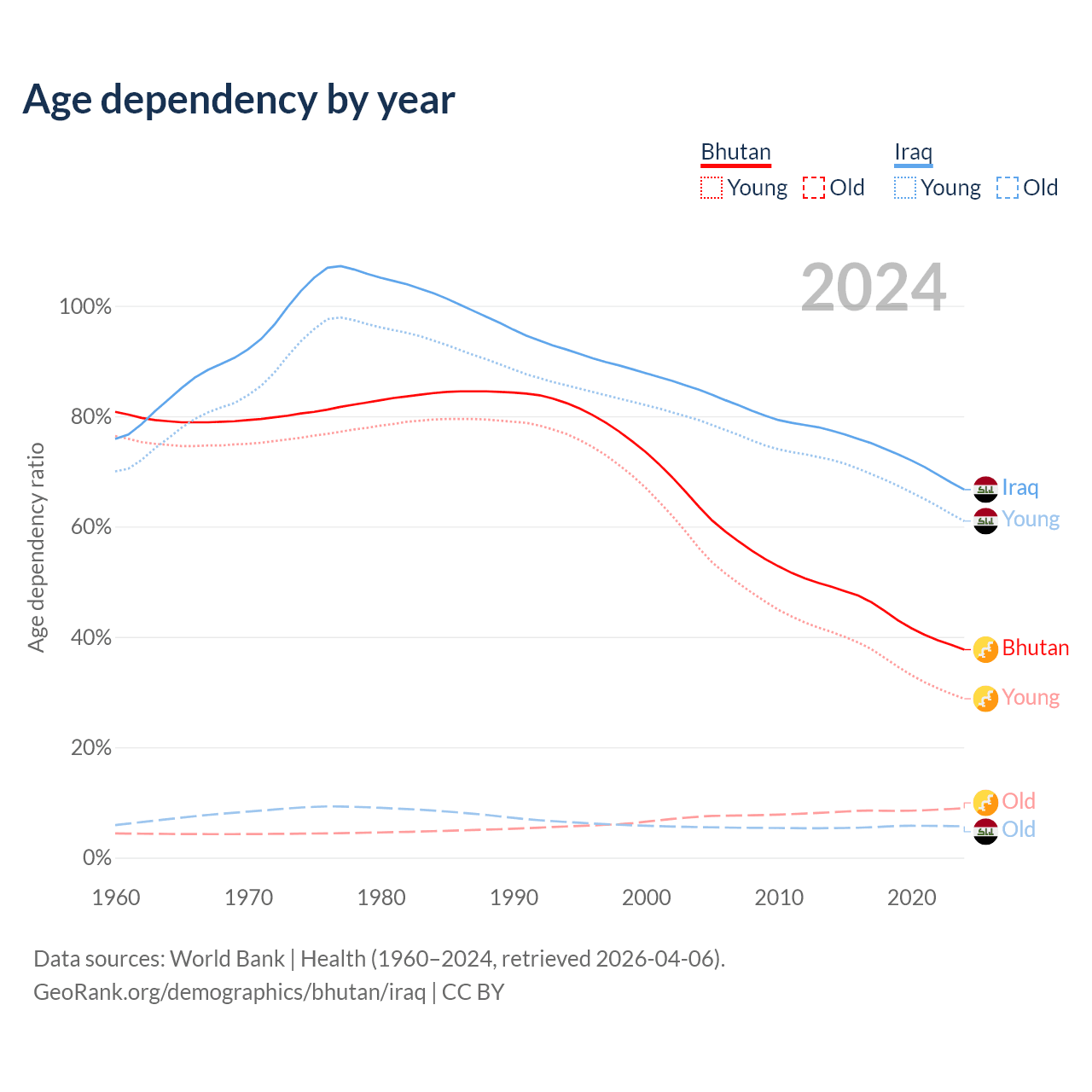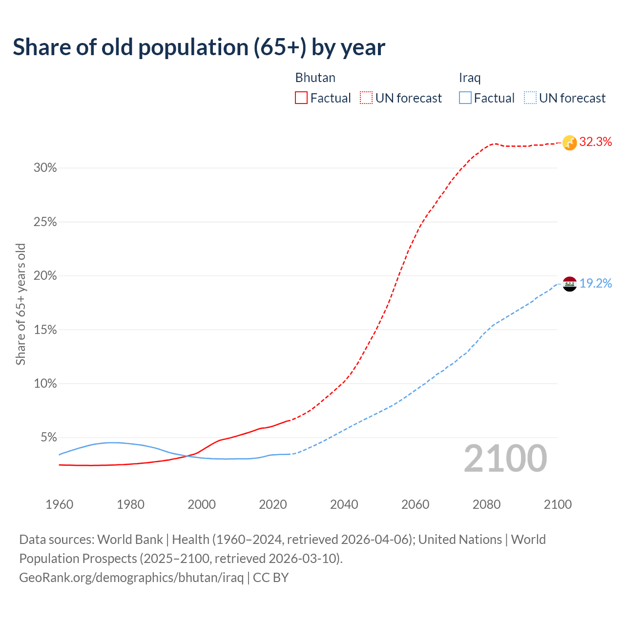 - The share of old-age demographic (65+) in Bhutan is 6.49% vs 3.41% in Iraq.