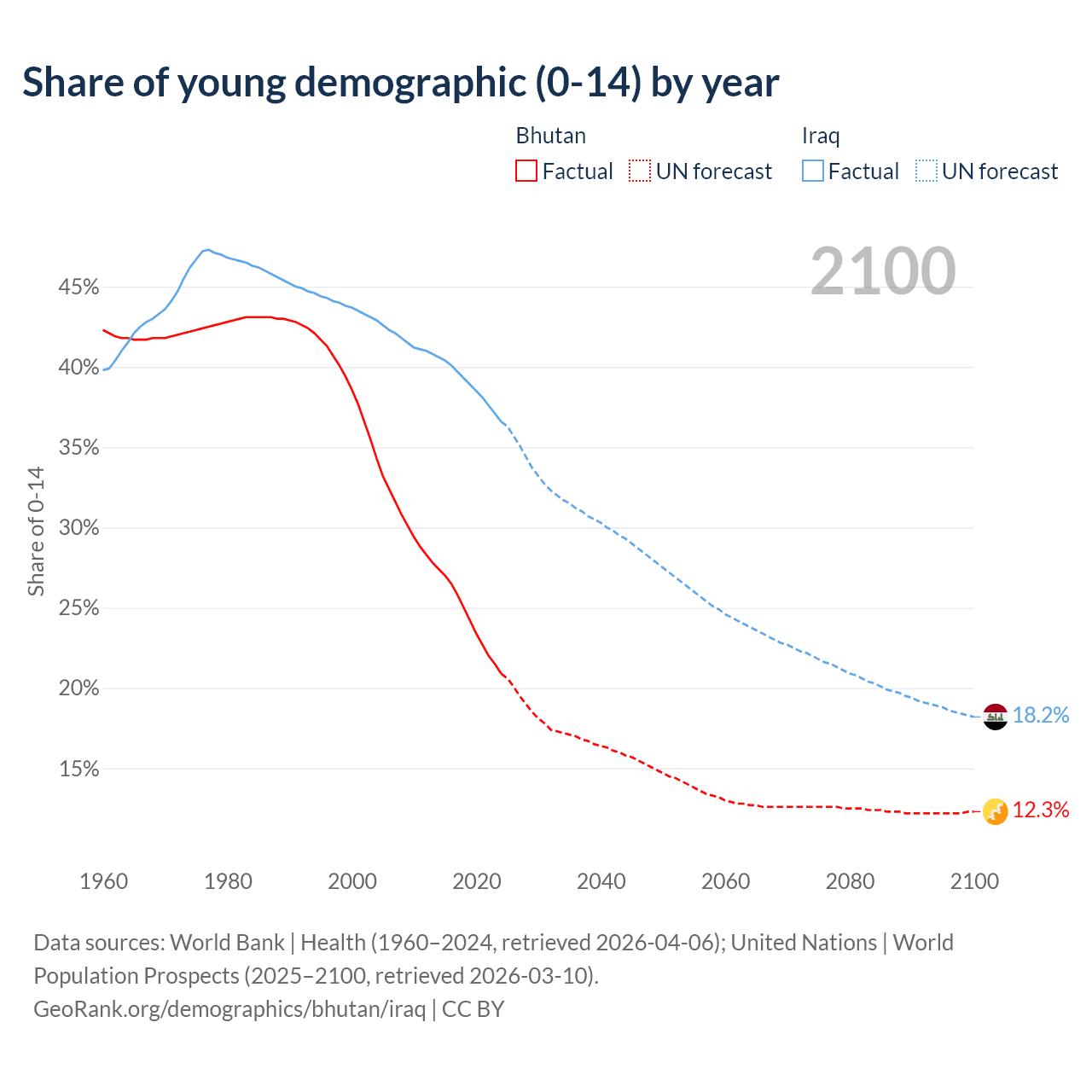 - The share of young demographic (0-15 years old) in Bhutan is 20.9% vs 36.6% in Iraq.