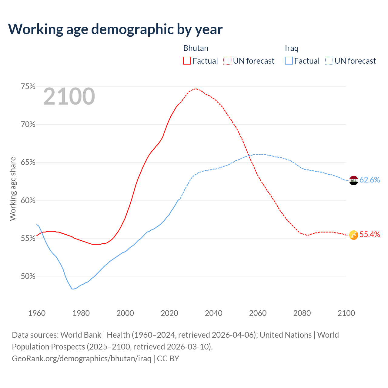 Median age Bhutan vs Iraq, 1960-2100