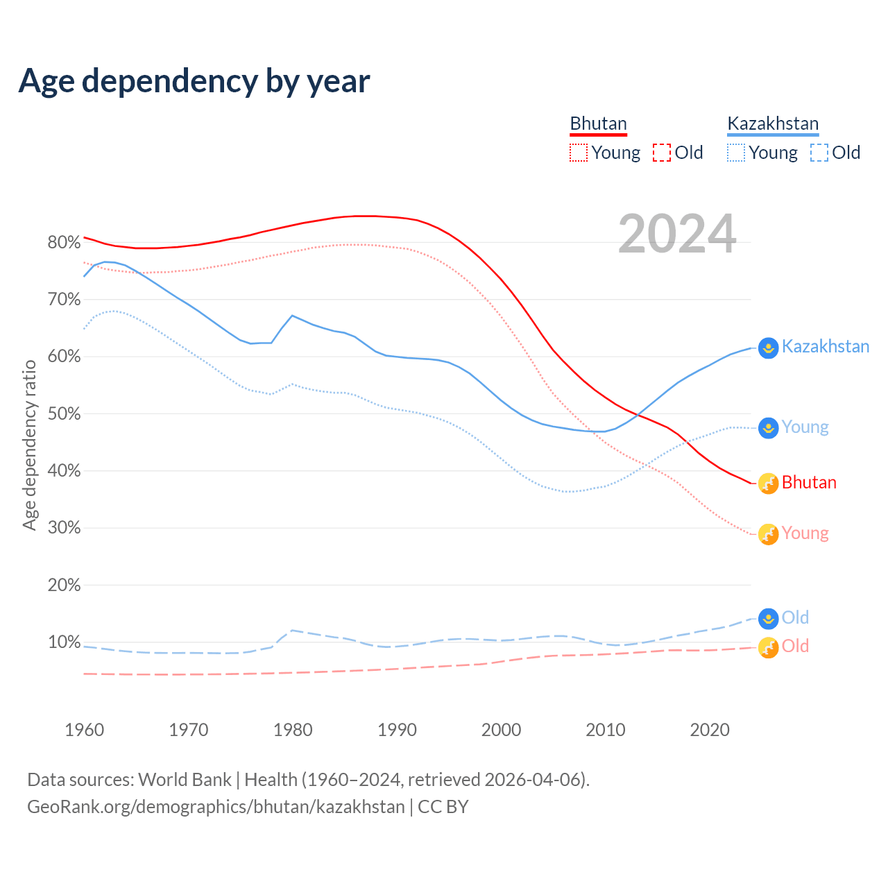 Data sources: World Bank | Health (1960–2024, retrieved 2026-04-06); U.S. Census Bureau (1960–2024, retrieved 2026-02-08).
