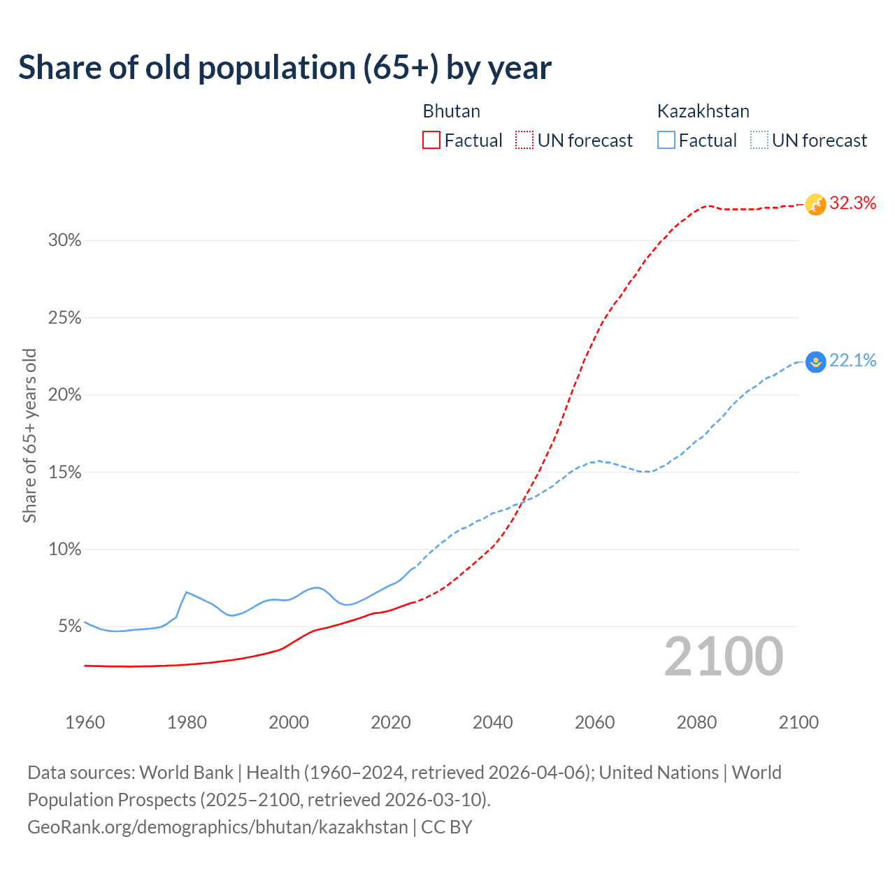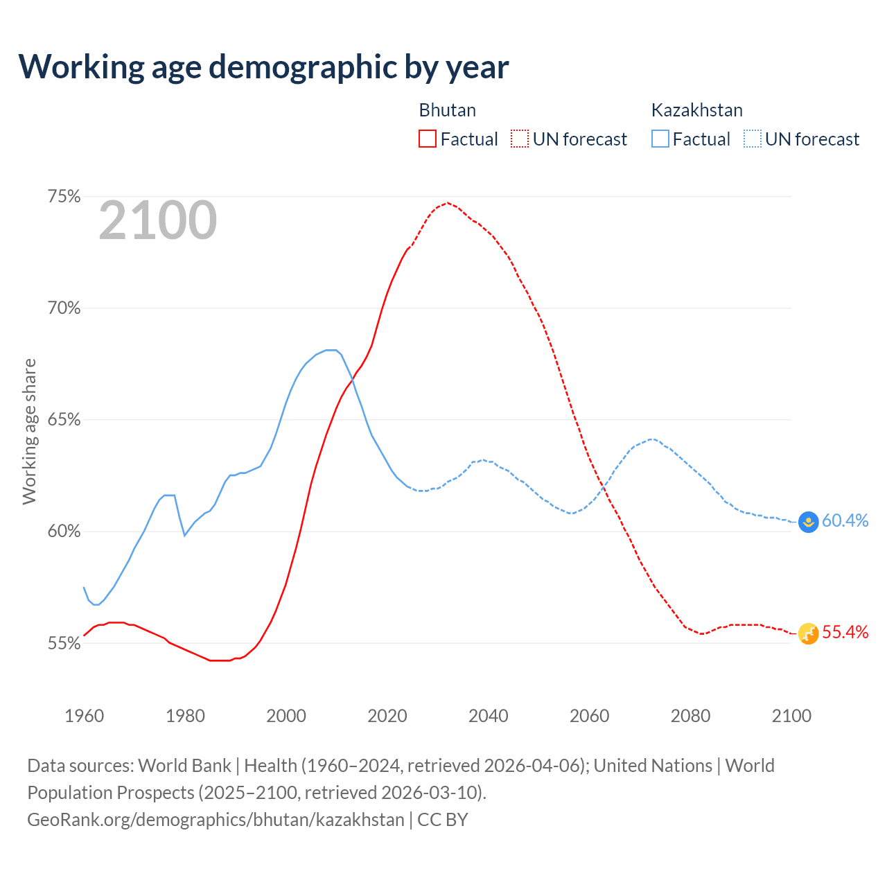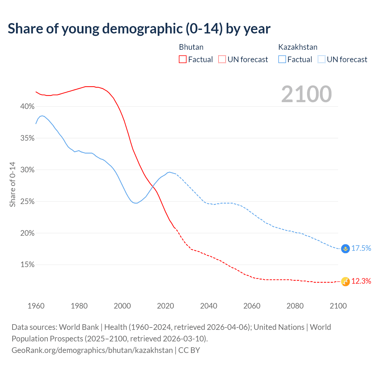 Median age Bhutan vs Kazakhstan, 1960-2100