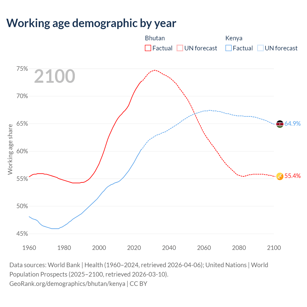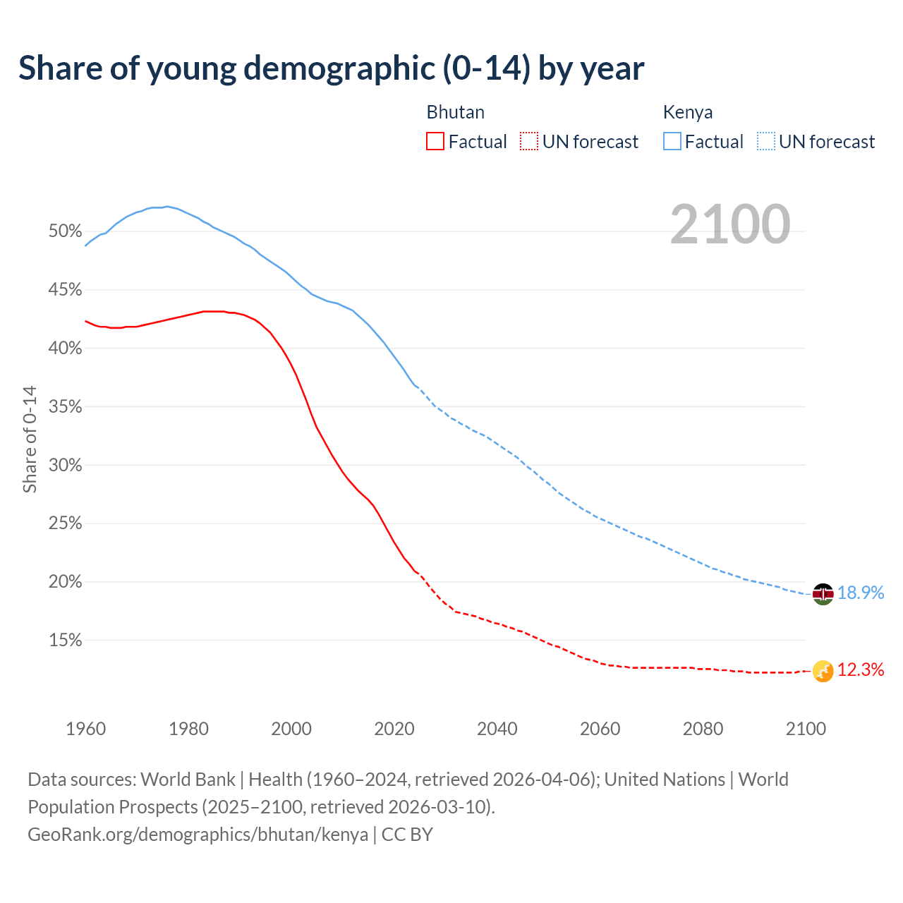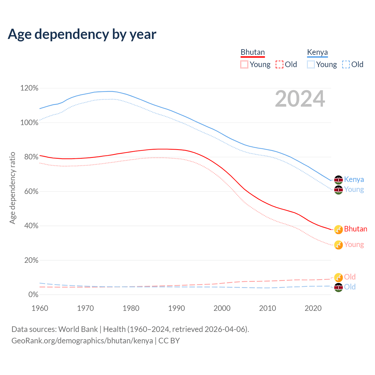 - Bhutan is ranked 95/196 by median age (oldest to youngest) vs 159/196 for Kenya.