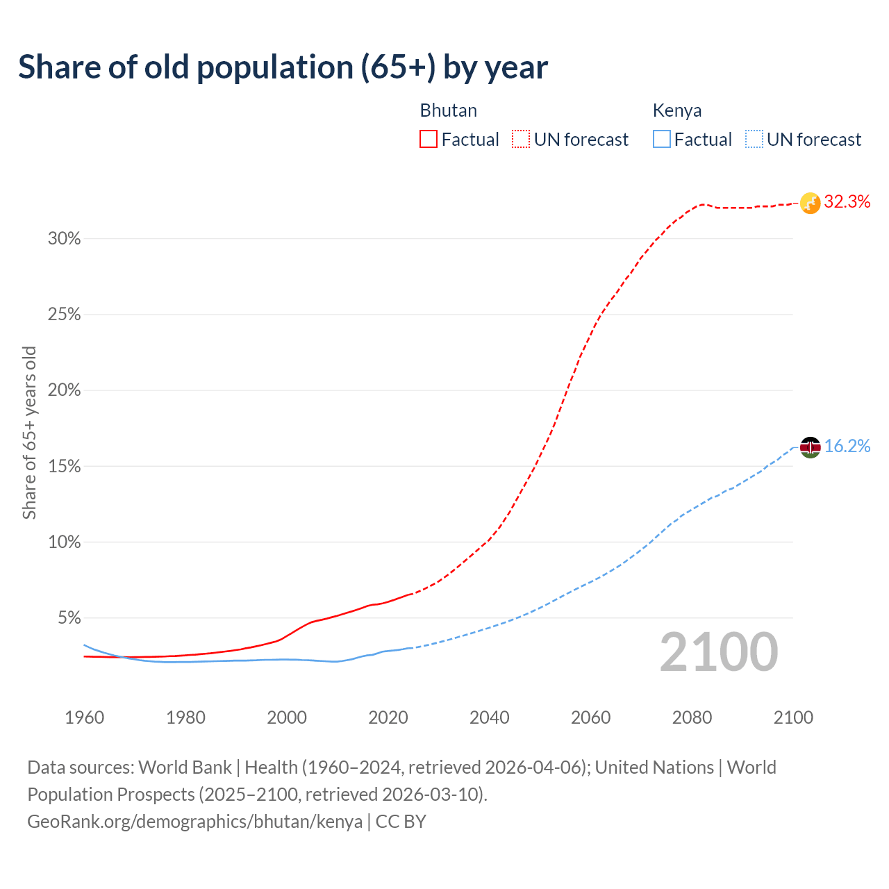 - The share of old-age demographic (65+) in Bhutan is 6.49% vs 2.97% in Kenya.