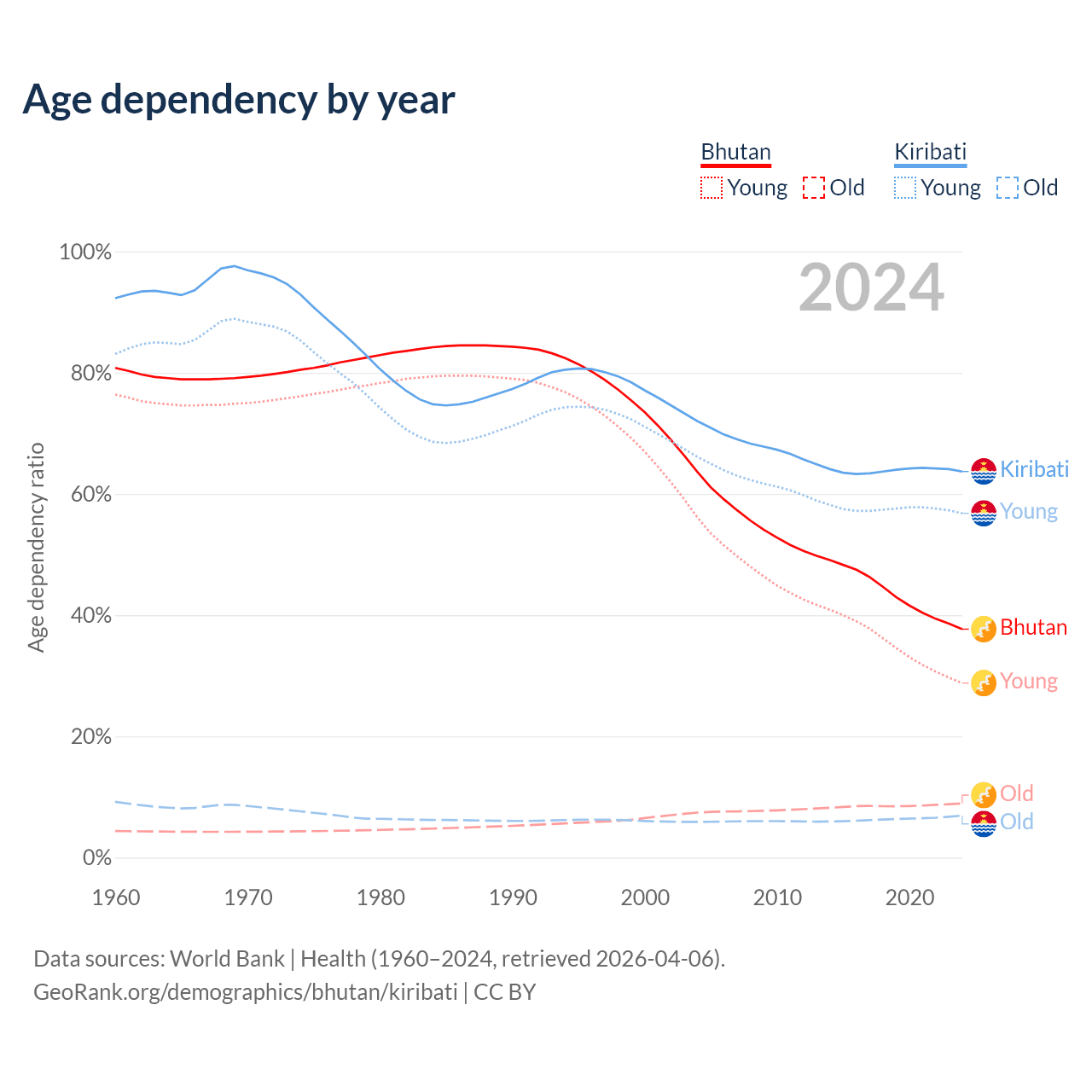 - The share of old-age demographic (65+) in Bhutan is 6.49% vs 4.24% in Kiribati.