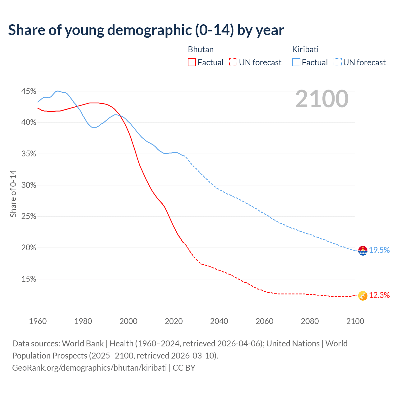 - The share of young demographic (0-15 years old) in Bhutan is 20.9% vs 34.7% in Kiribati.