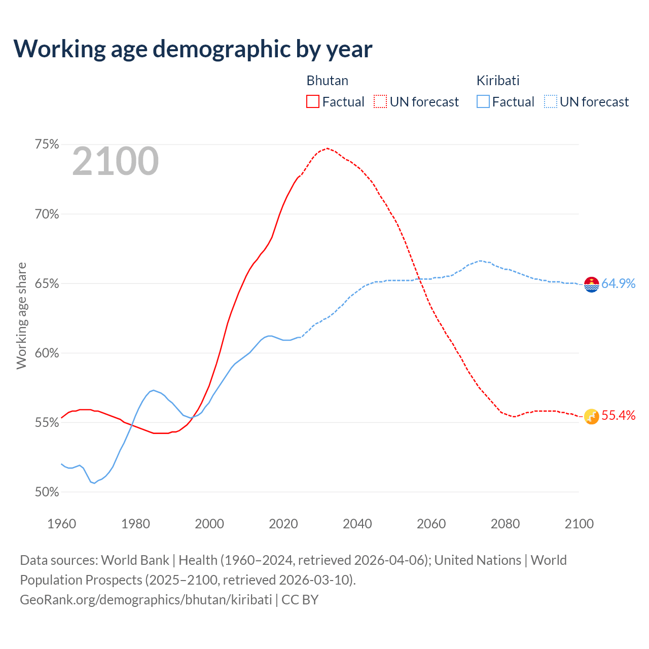 - Bhutan has 583K working age adults (aged 15-64) vs 84.9K in Kiribati.
