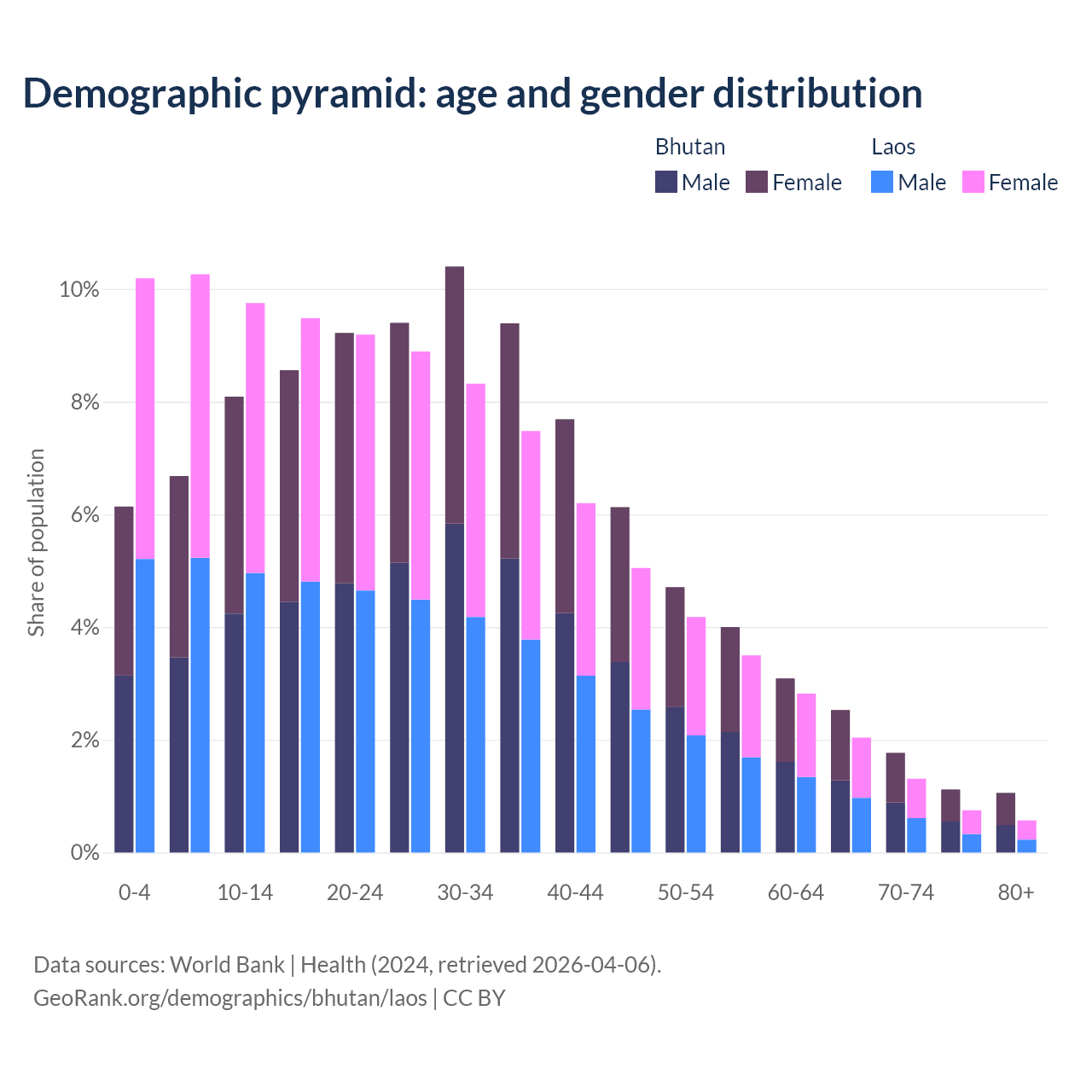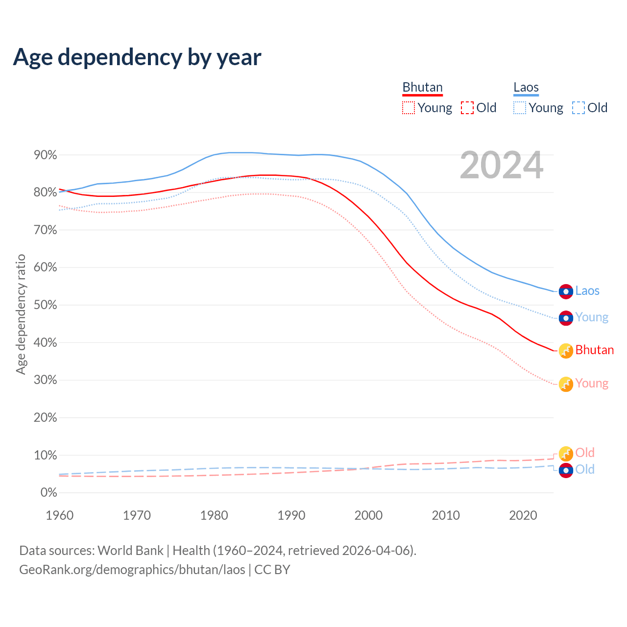 - Bhutan is ranked 95/196 by median age (oldest to youngest) vs 130/196 for Laos.