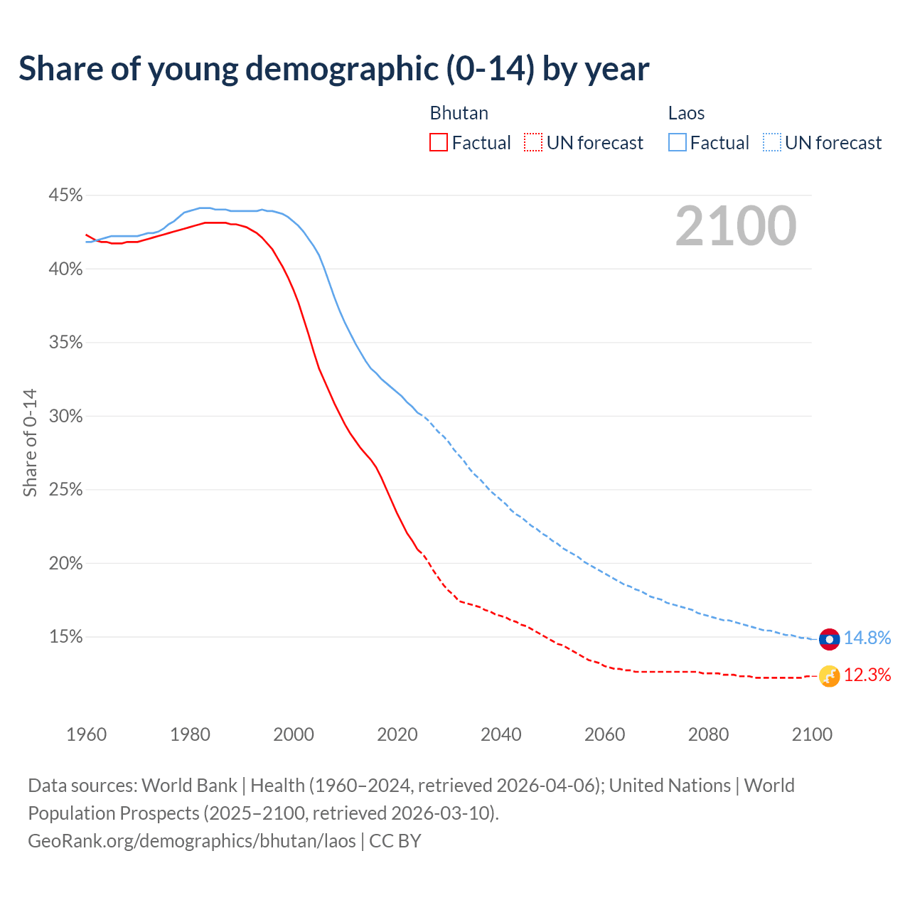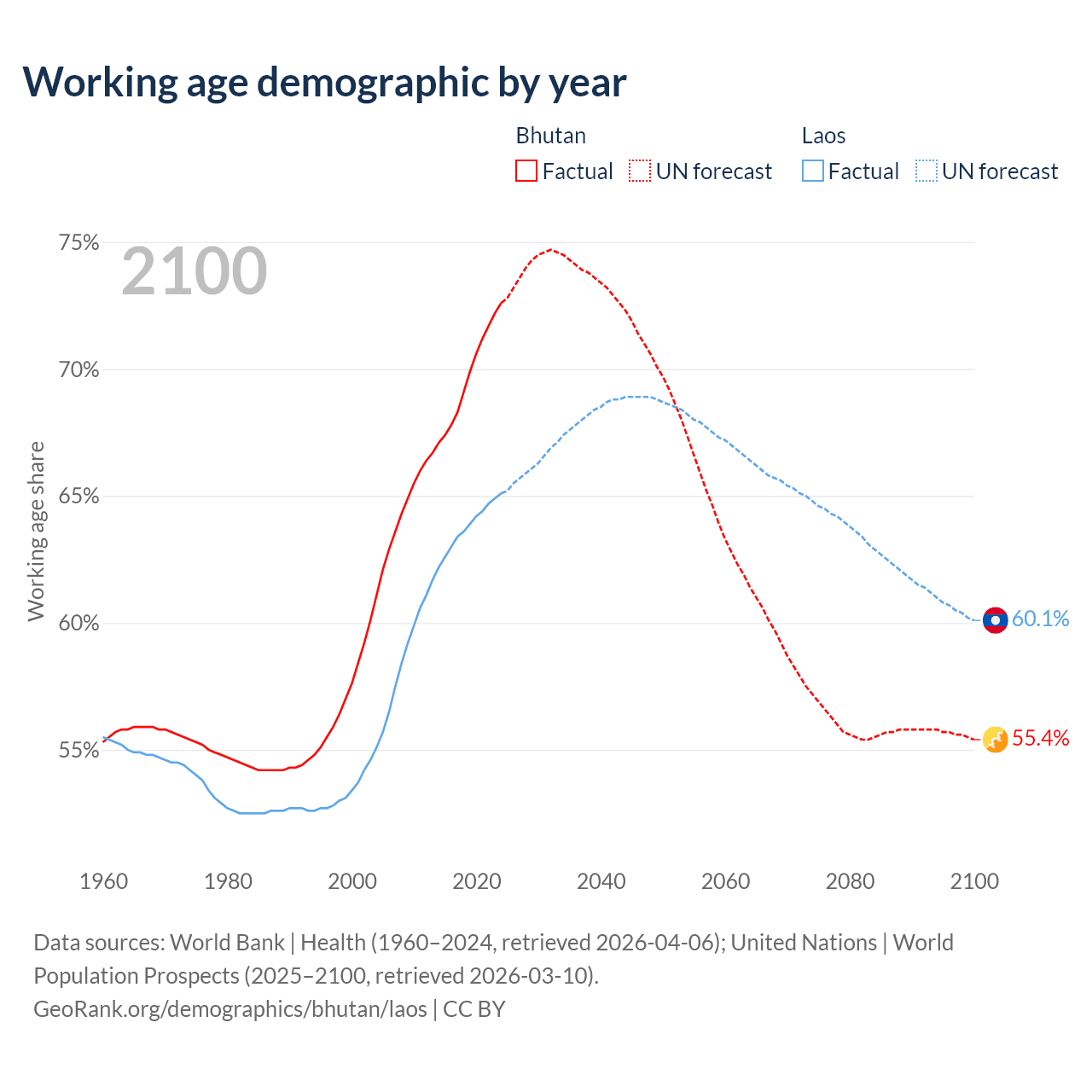 Median age Bhutan vs Laos, 1960-2100