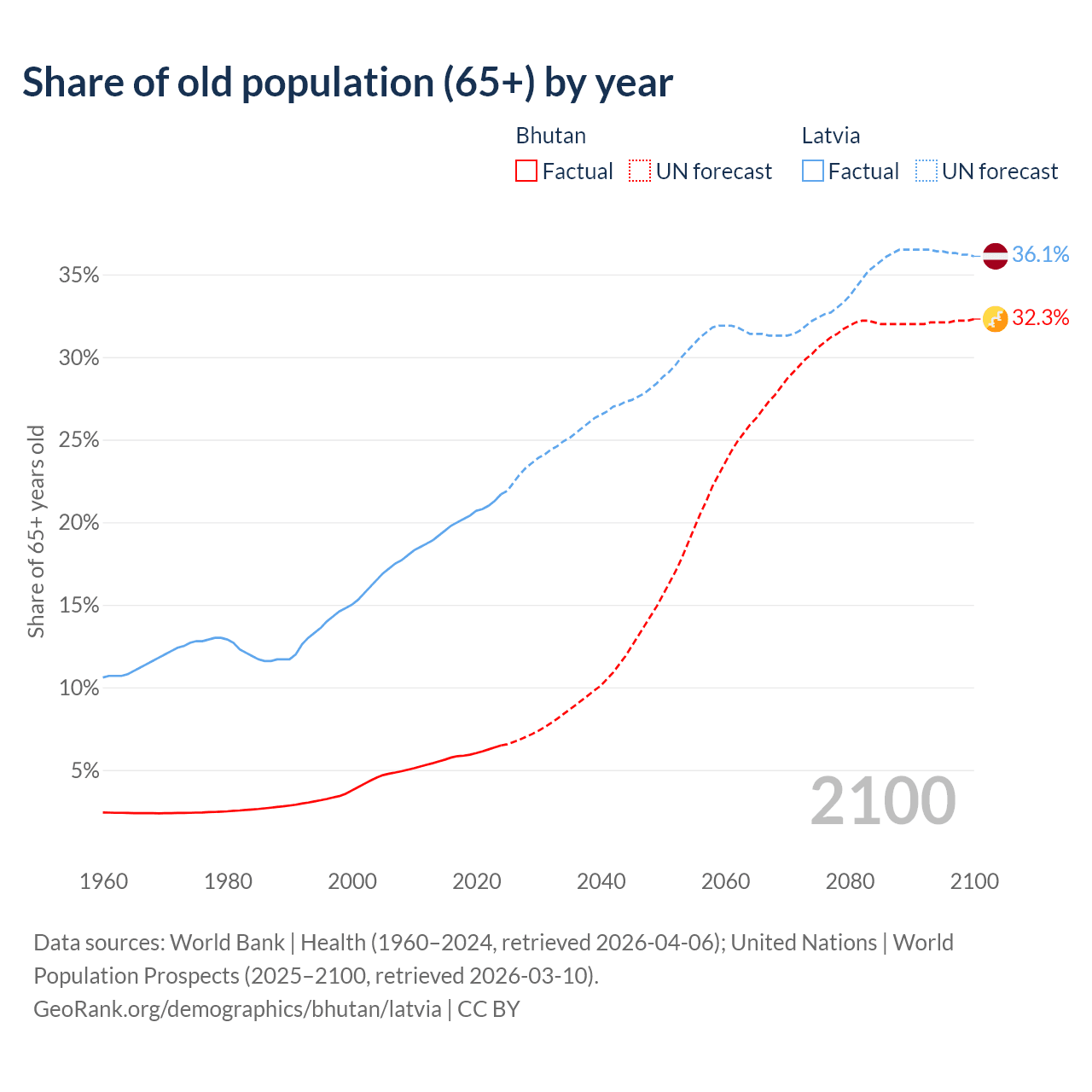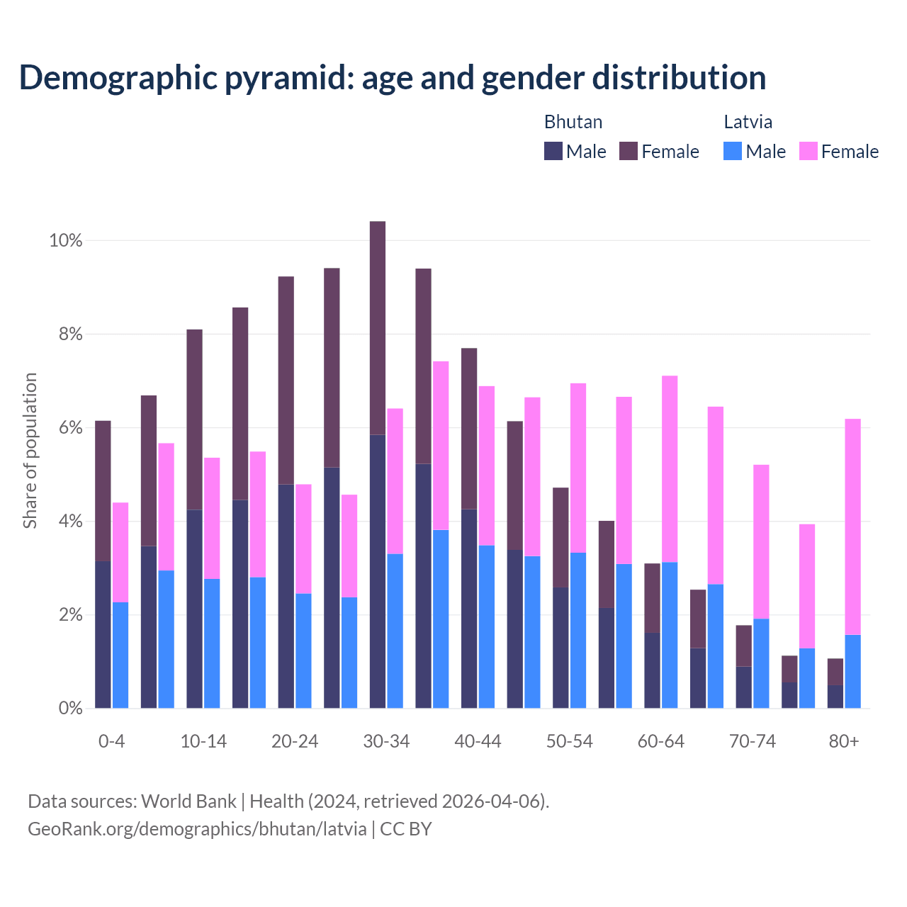 - The share of old-age demographic (65+) in Bhutan is 6.49% vs 21.7% in Latvia.