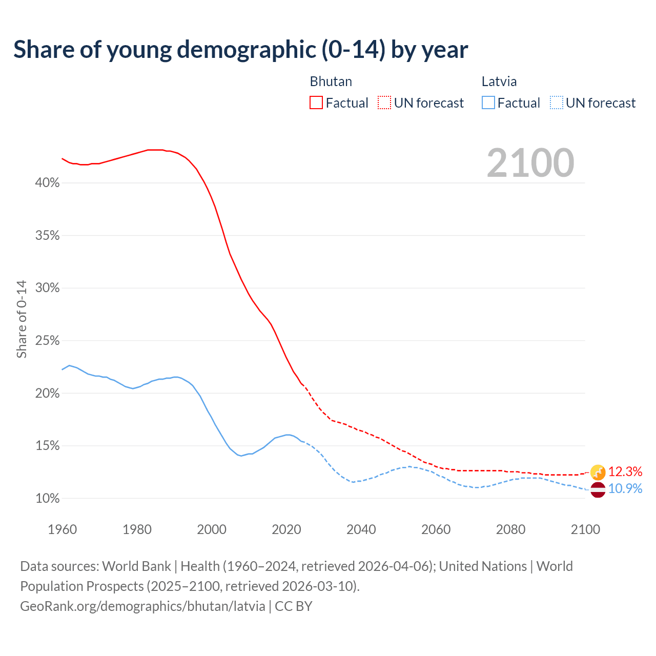 - The share of young demographic (0-15 years old) in Bhutan is 20.9% vs 15.4% in Latvia.