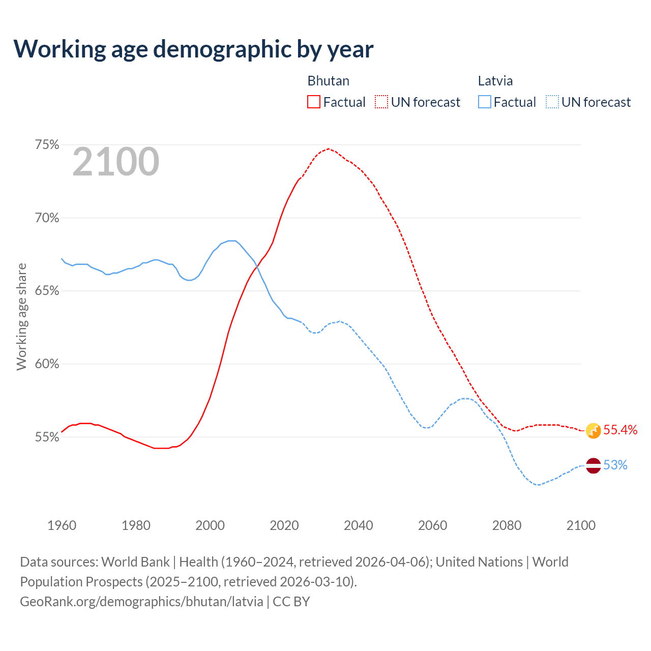 Median age Bhutan vs Latvia, 1960-2100