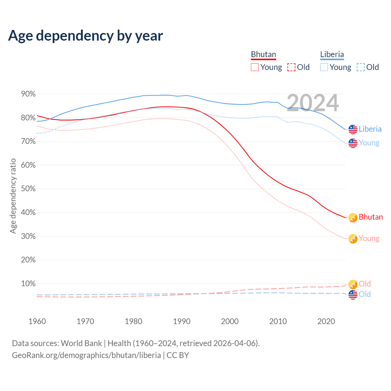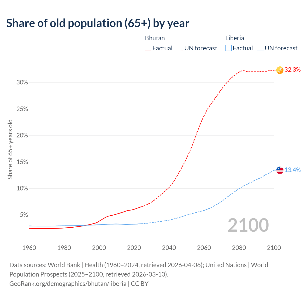 - The share of old-age demographic (65+) in Bhutan is 6.49% vs 3.3% in Liberia.