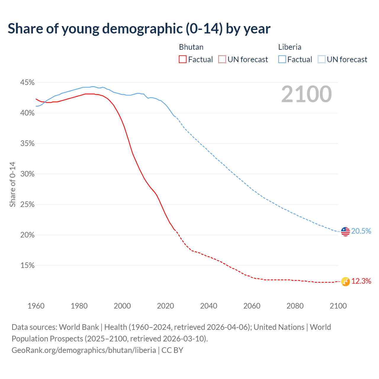 - The share of young demographic (0-15 years old) in Bhutan is 20.9% vs 39.5% in Liberia.