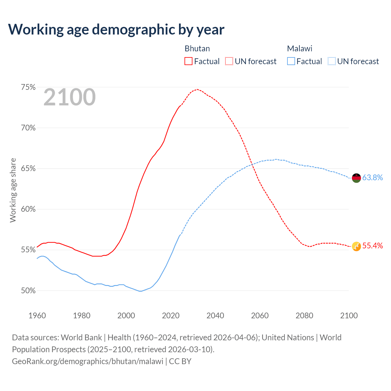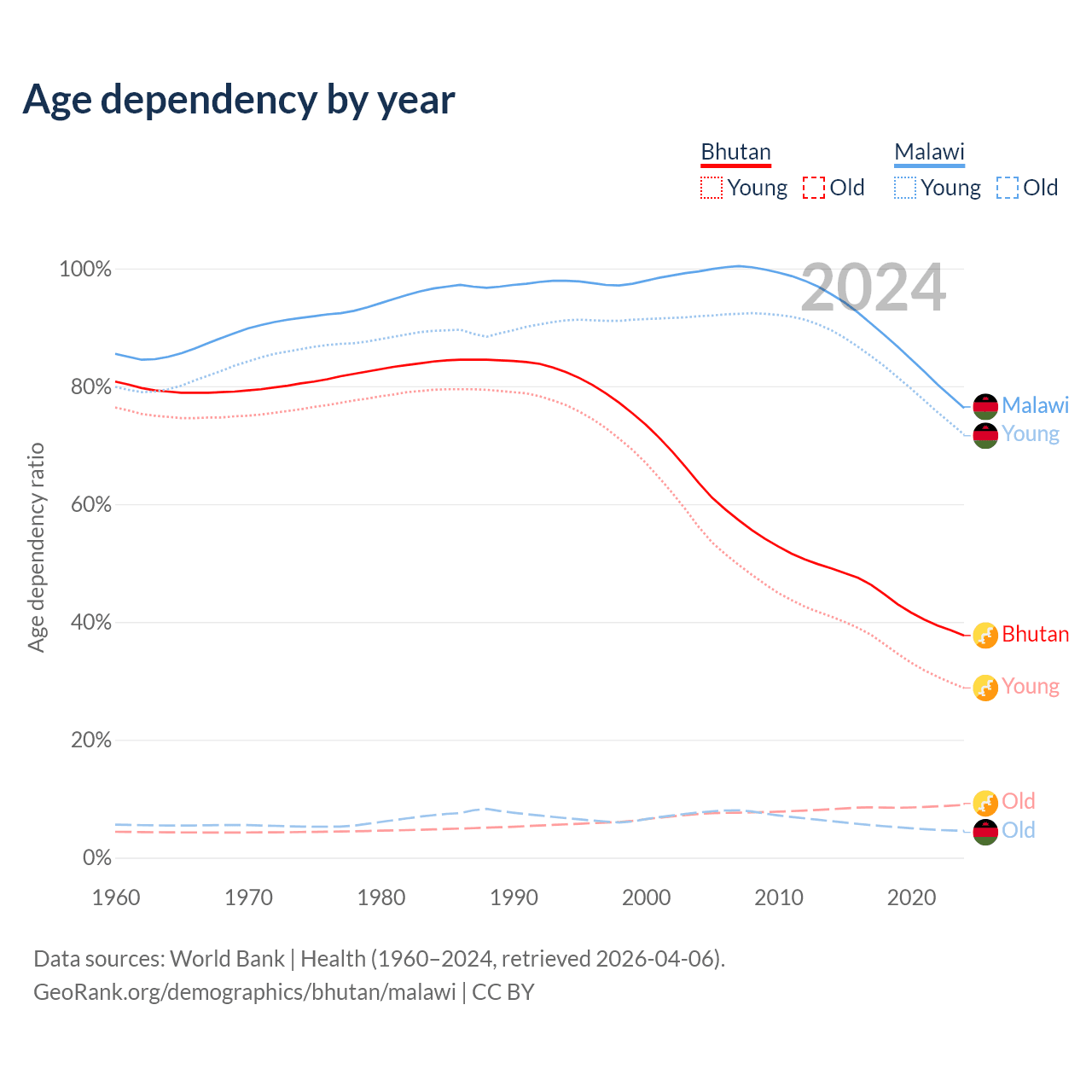 - Bhutan is ranked 95/196 by median age (oldest to youngest) vs 181/196 for Malawi.