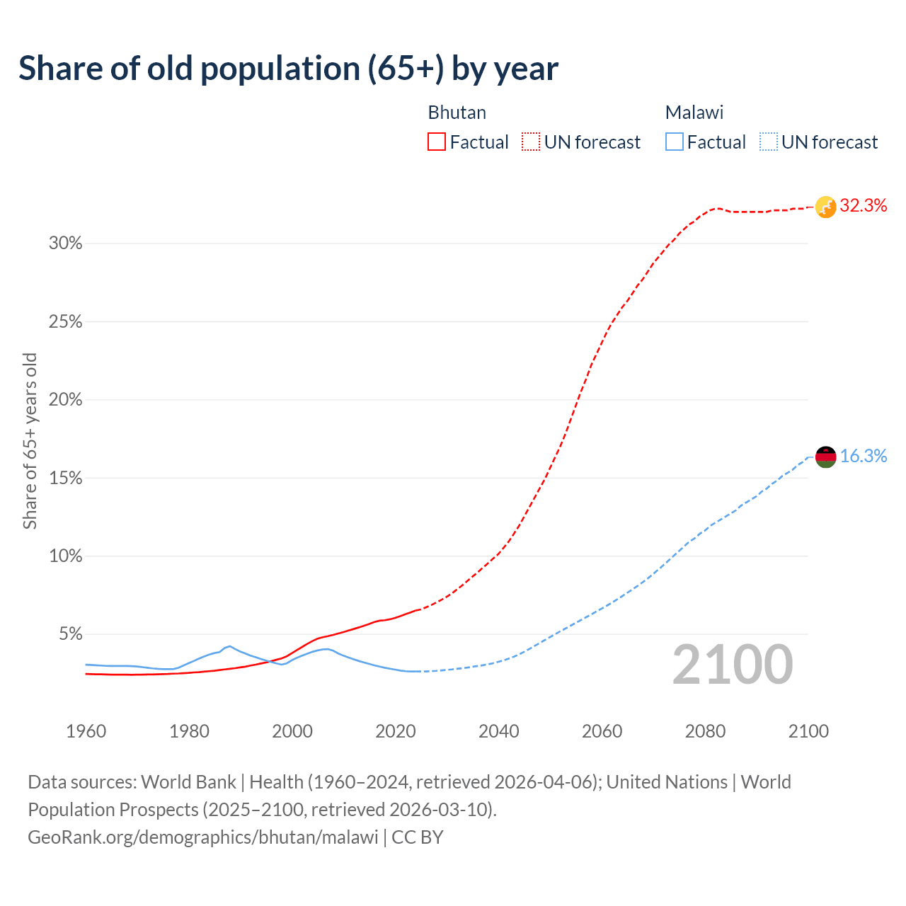 - The share of old-age demographic (65+) in Bhutan is 6.49% vs 2.59% in Malawi.