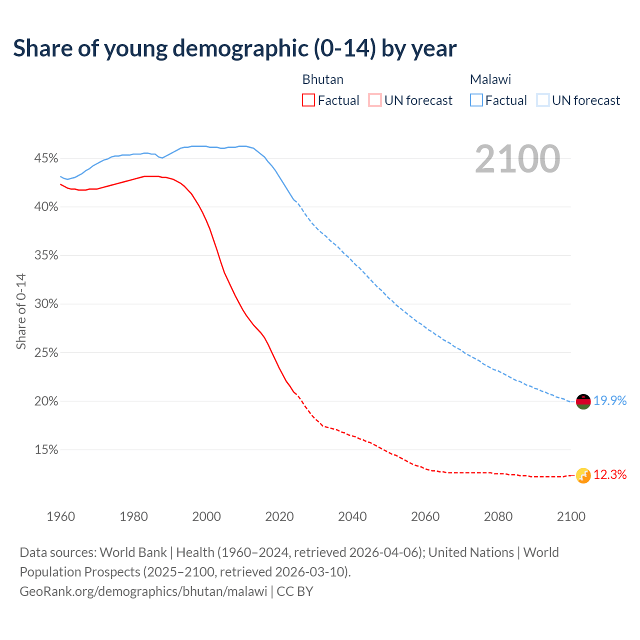 - The share of young demographic (0-15 years old) in Bhutan is 20.9% vs 40.7% in Malawi.