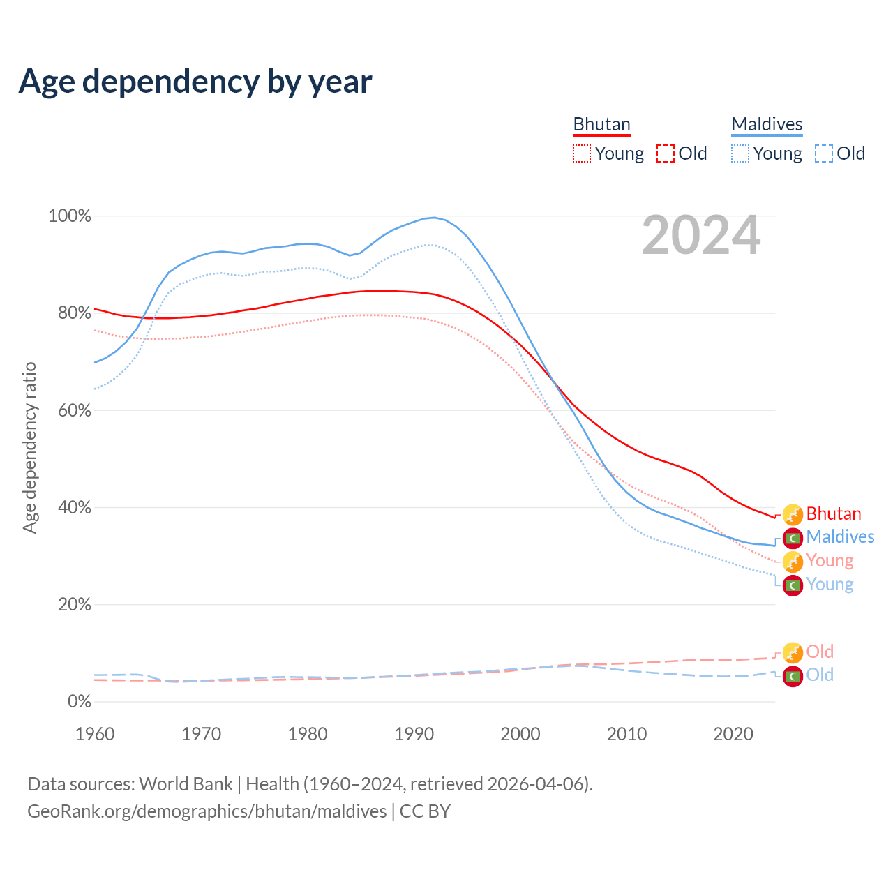 Data sources: World Bank | Health (1960–2024, retrieved 2026-04-06); U.S. Census Bureau (1960–2024, retrieved 2026-02-08).