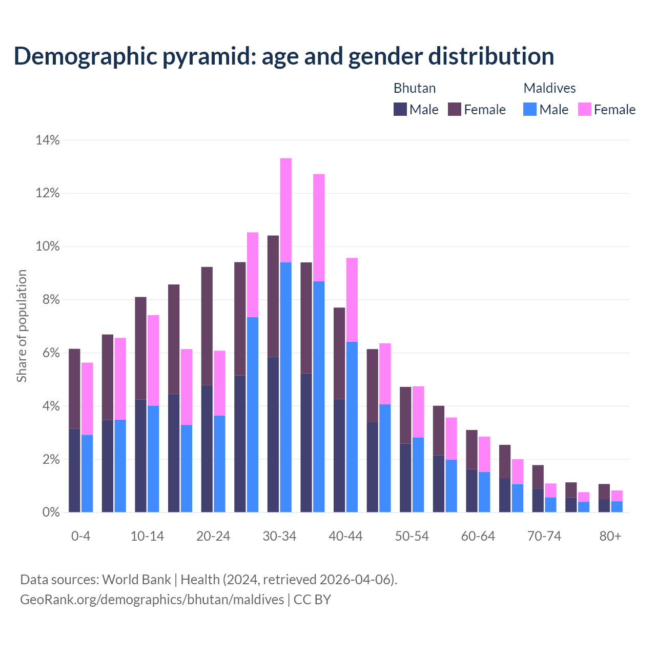 - Bhutan is ranked 95/196 by median age (oldest to youngest) vs 90/196 for Maldives.