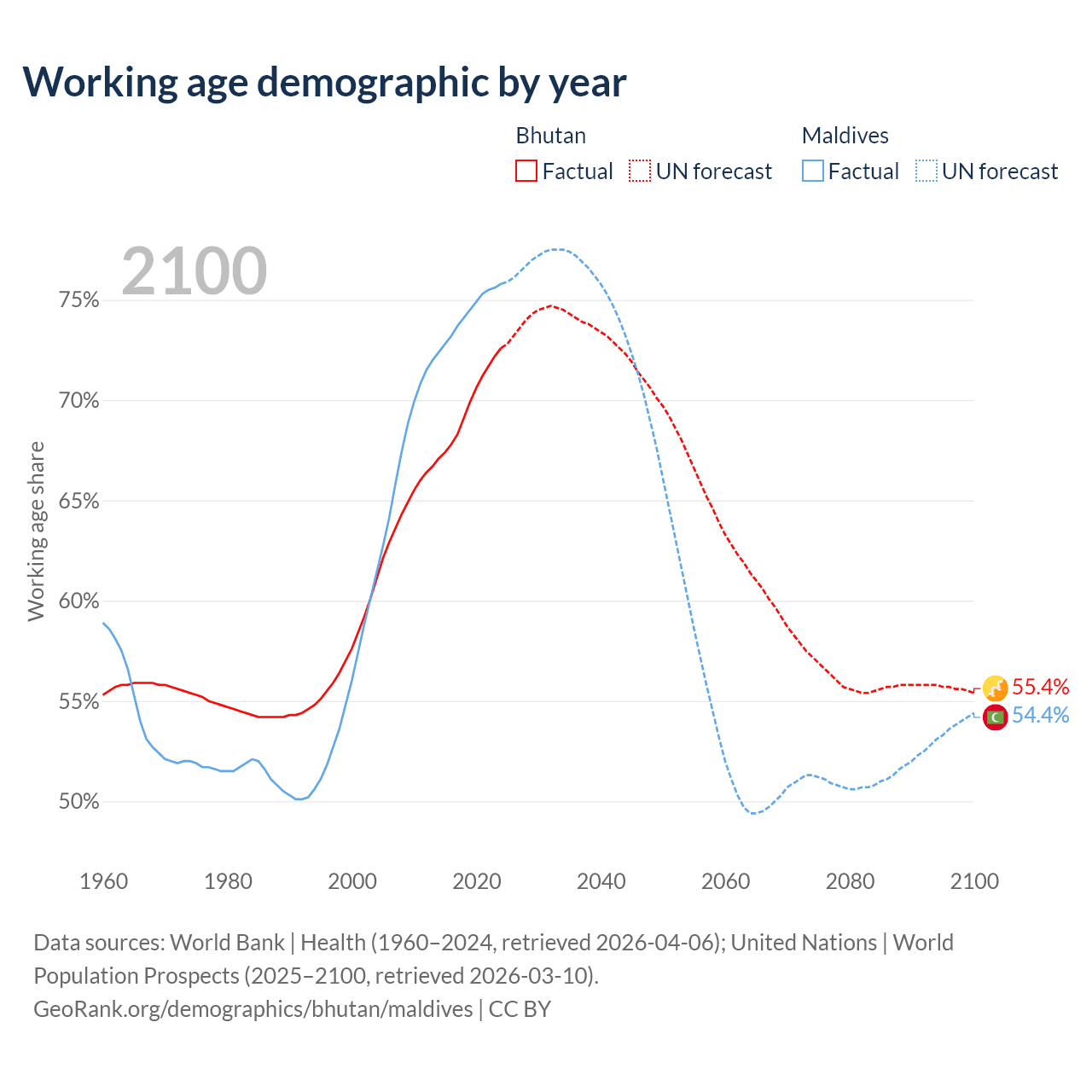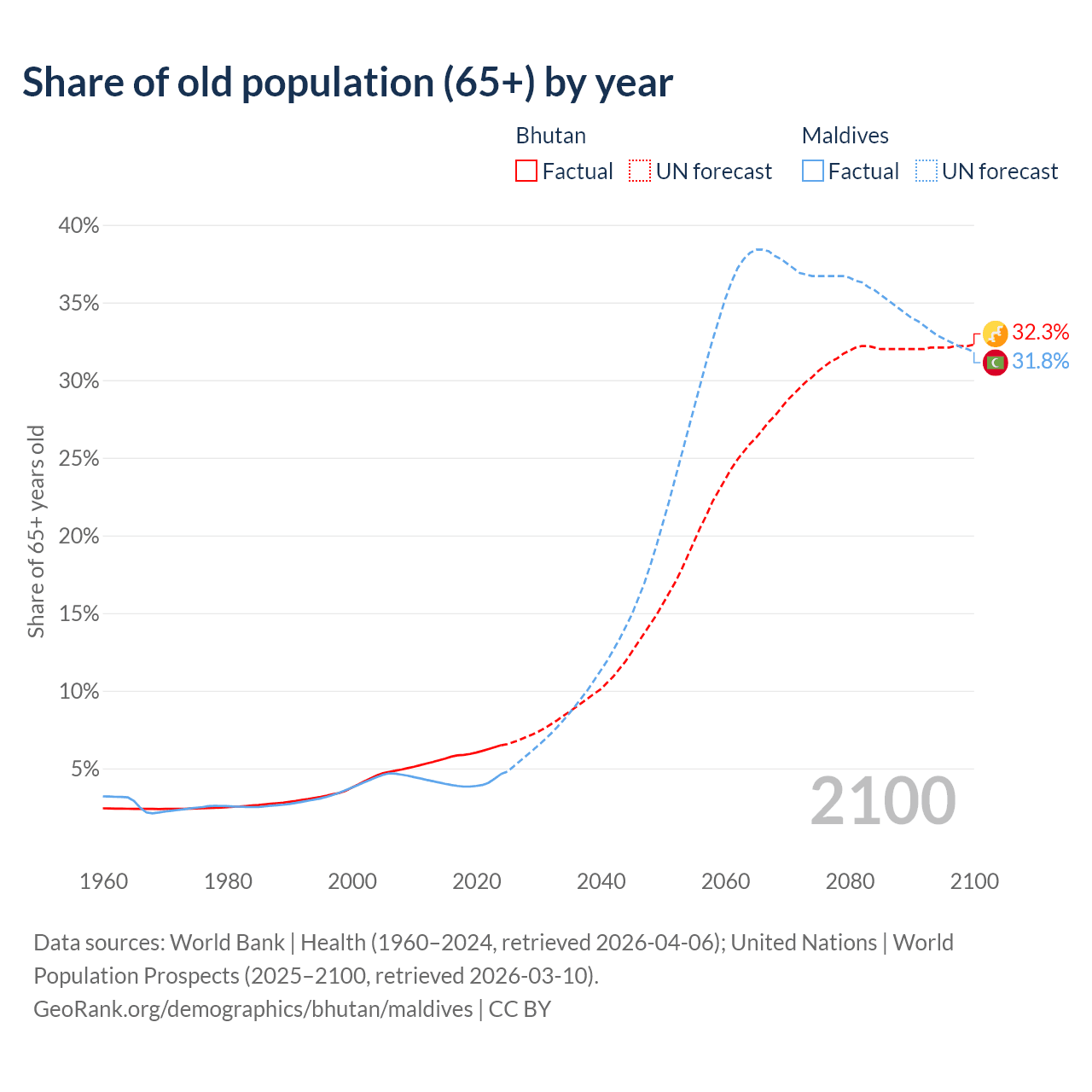 Median age Bhutan vs Maldives, 1960-2100