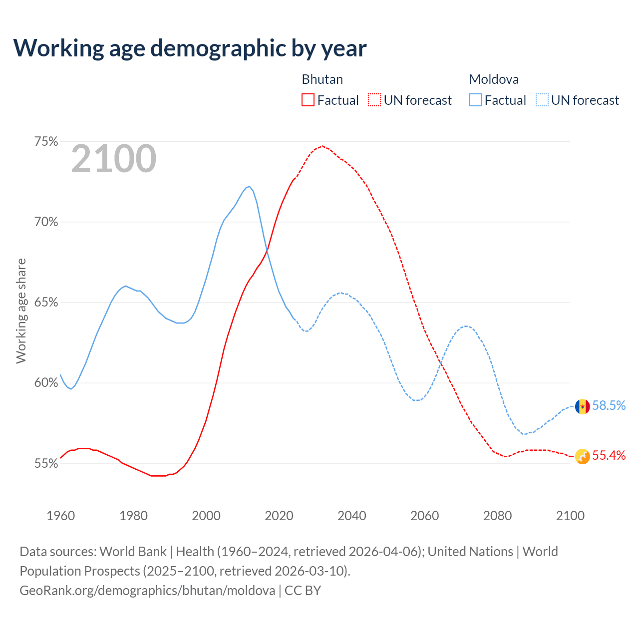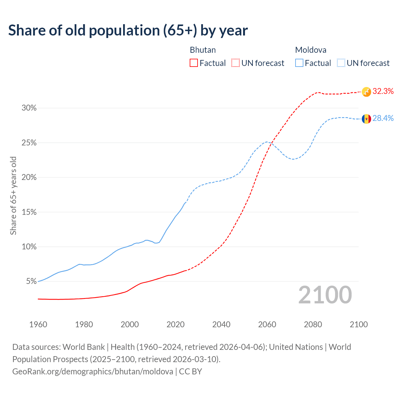 Median age Bhutan vs Moldova, 1960-2100