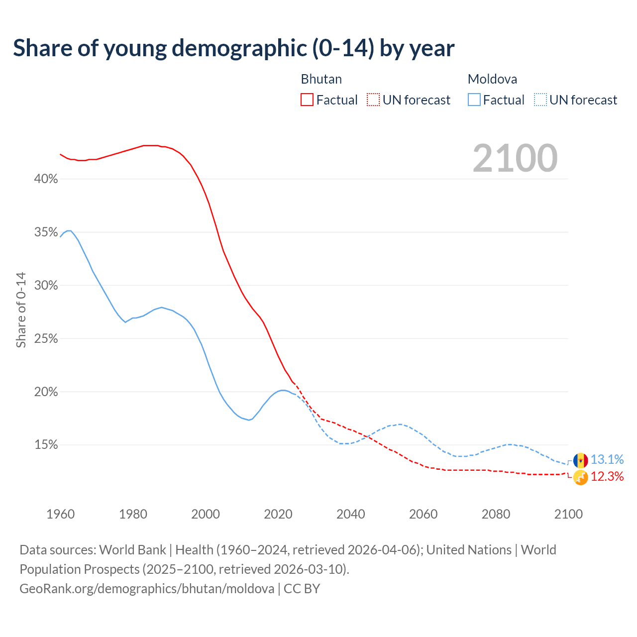 - The share of young demographic (0-15 years old) in Bhutan is 20.9% vs 19.8% in Moldova.