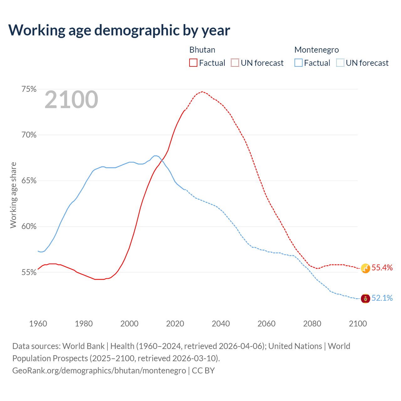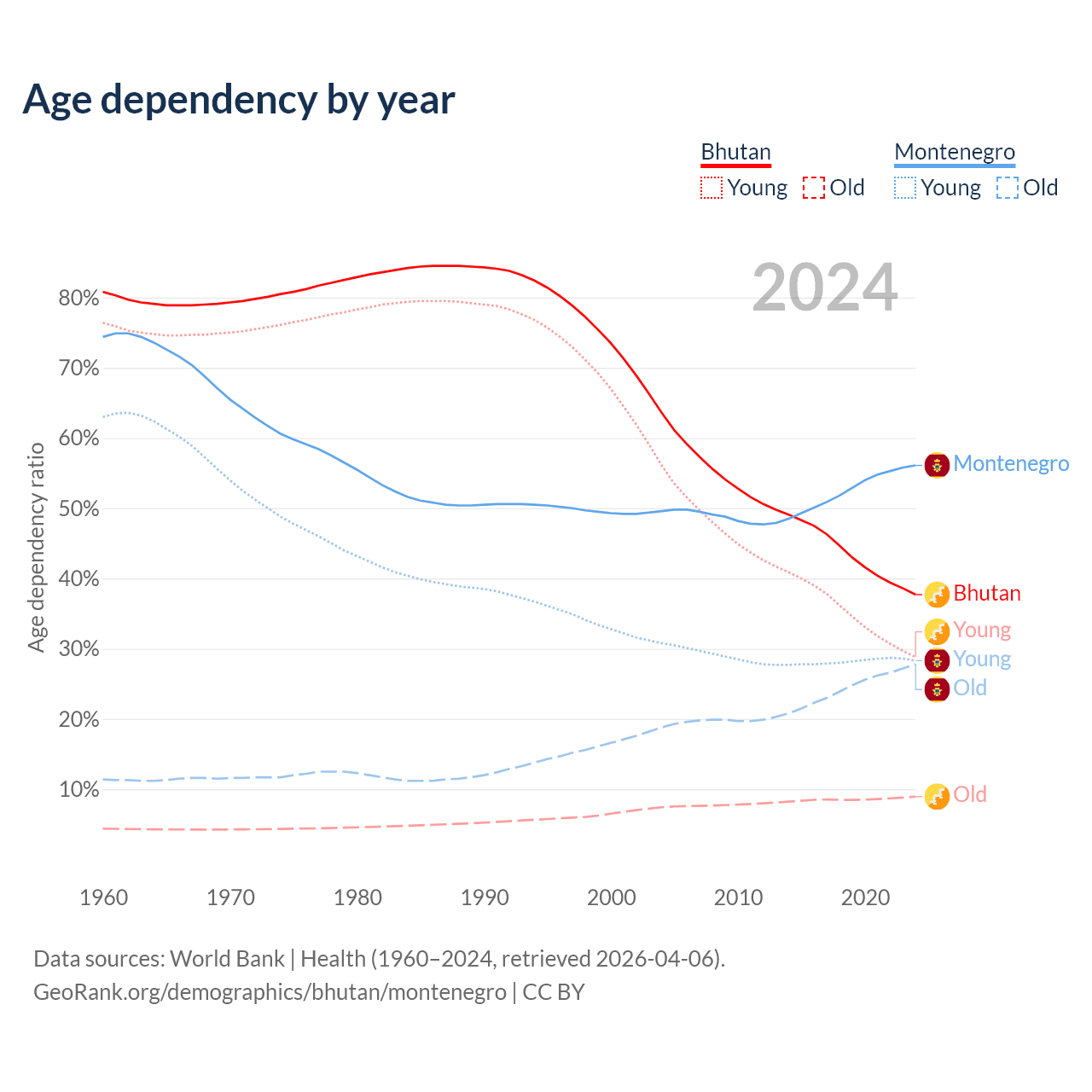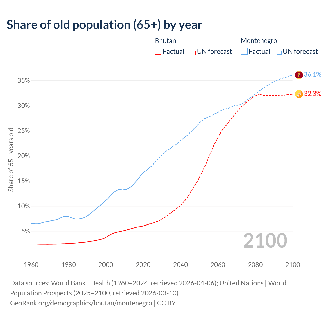 - The share of old-age demographic (65+) in Bhutan is 6.49% vs 17.8% in Montenegro.