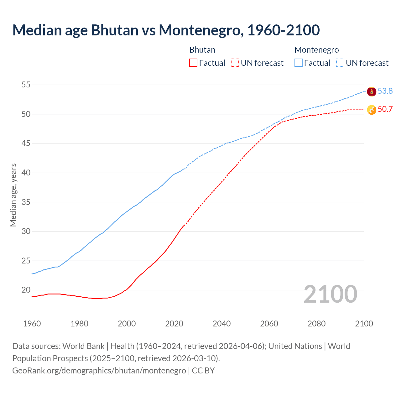 - Bhutan is ranked 95/196 by median age (oldest to youngest) vs 45/196 for Montenegro.