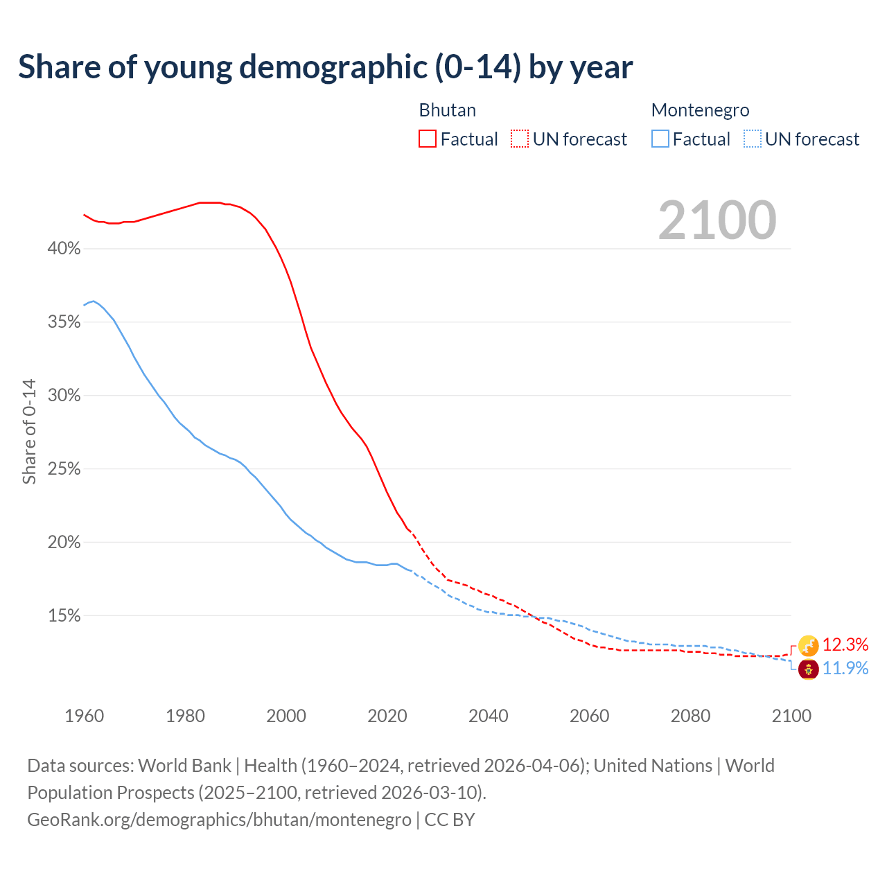 - The share of young demographic (0-15 years old) in Bhutan is 20.9% vs 18.1% in Montenegro.