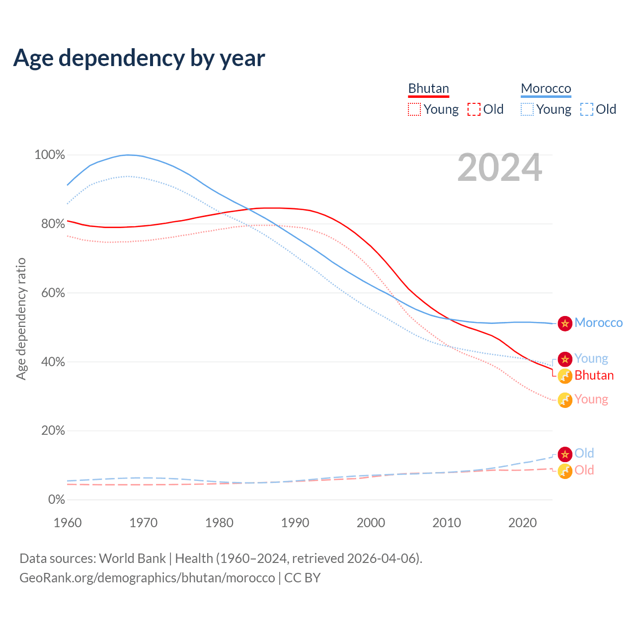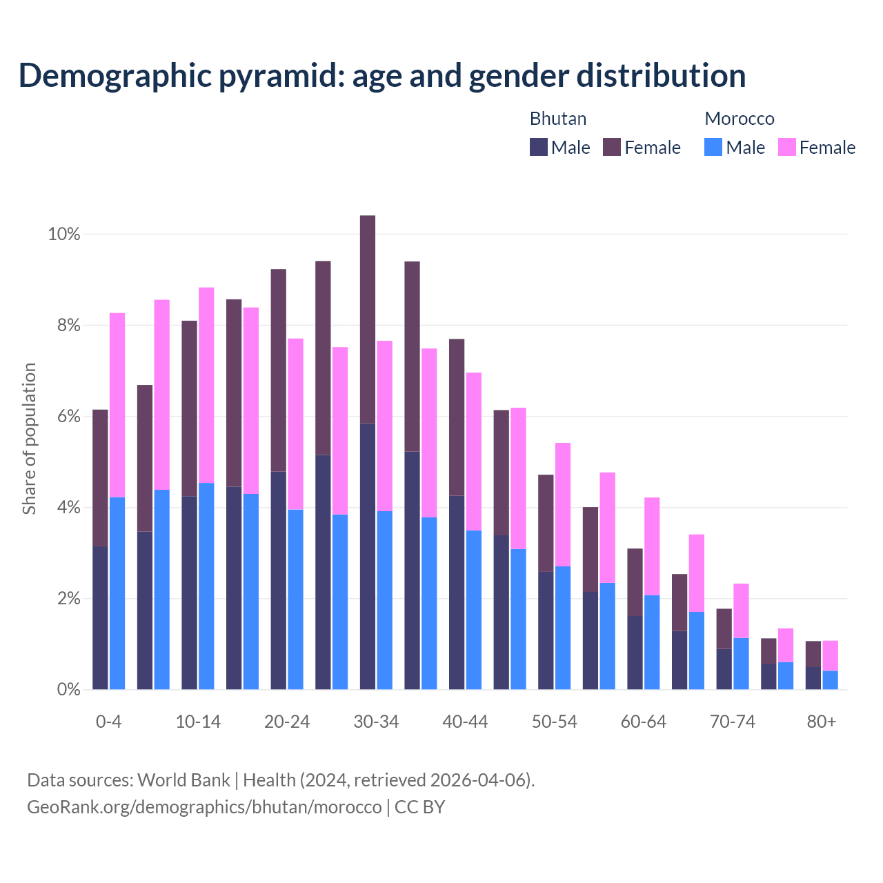 - Bhutan is ranked 95/196 by median age (oldest to youngest) vs 100/196 for Morocco.