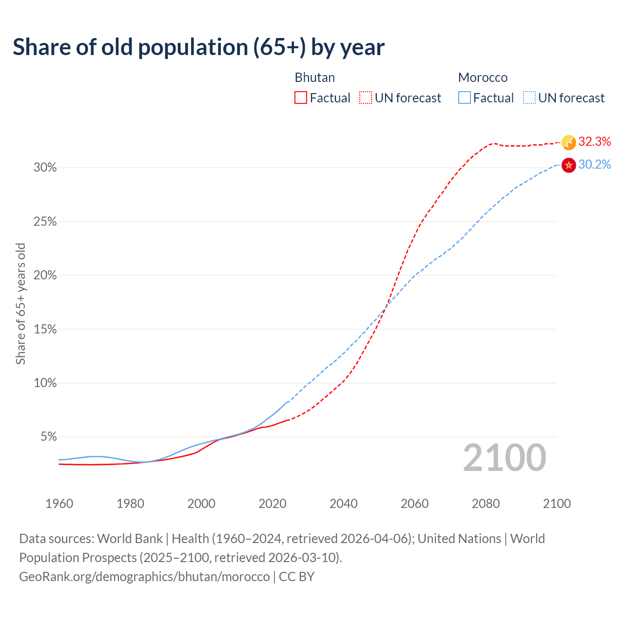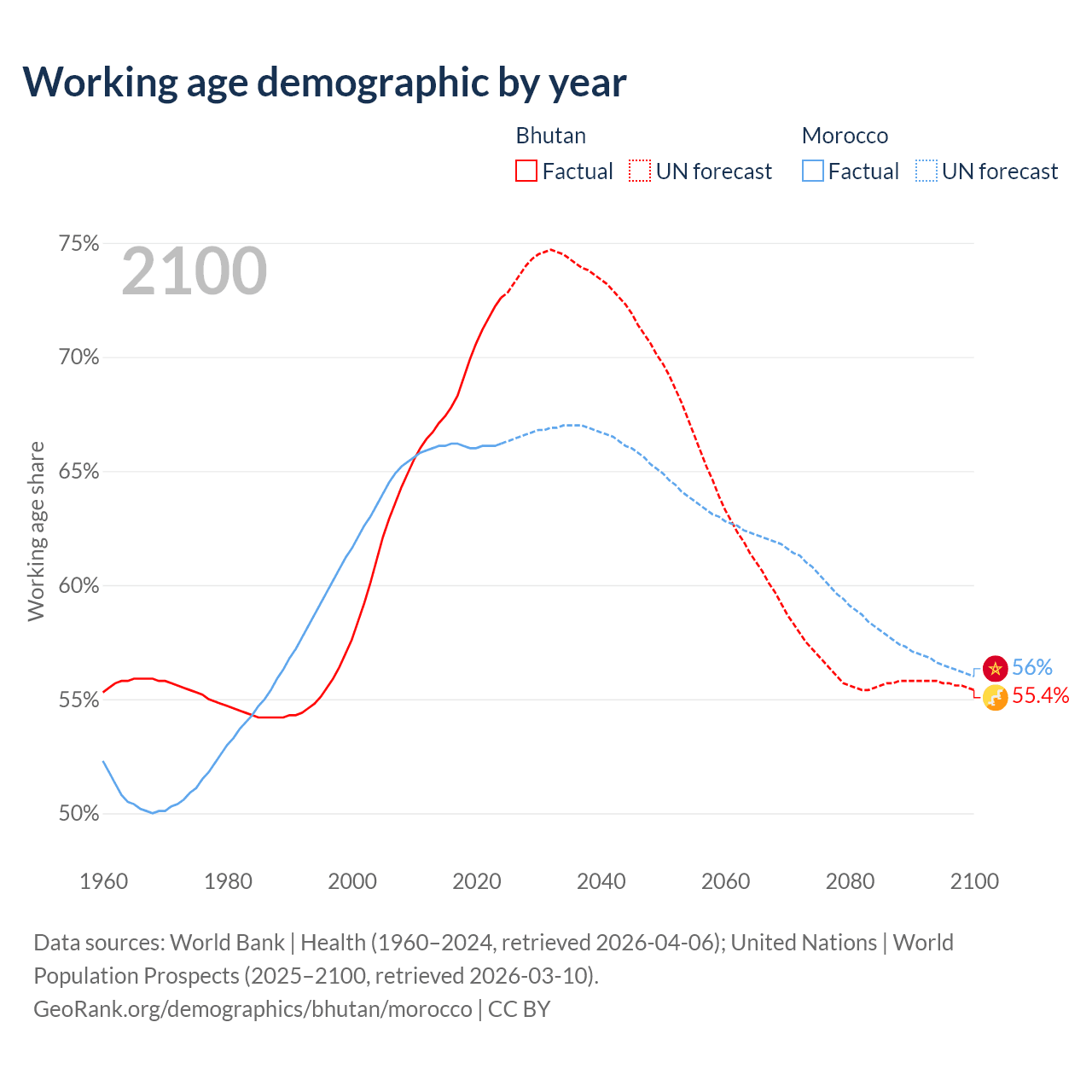 Median age Bhutan vs Morocco, 1960-2100